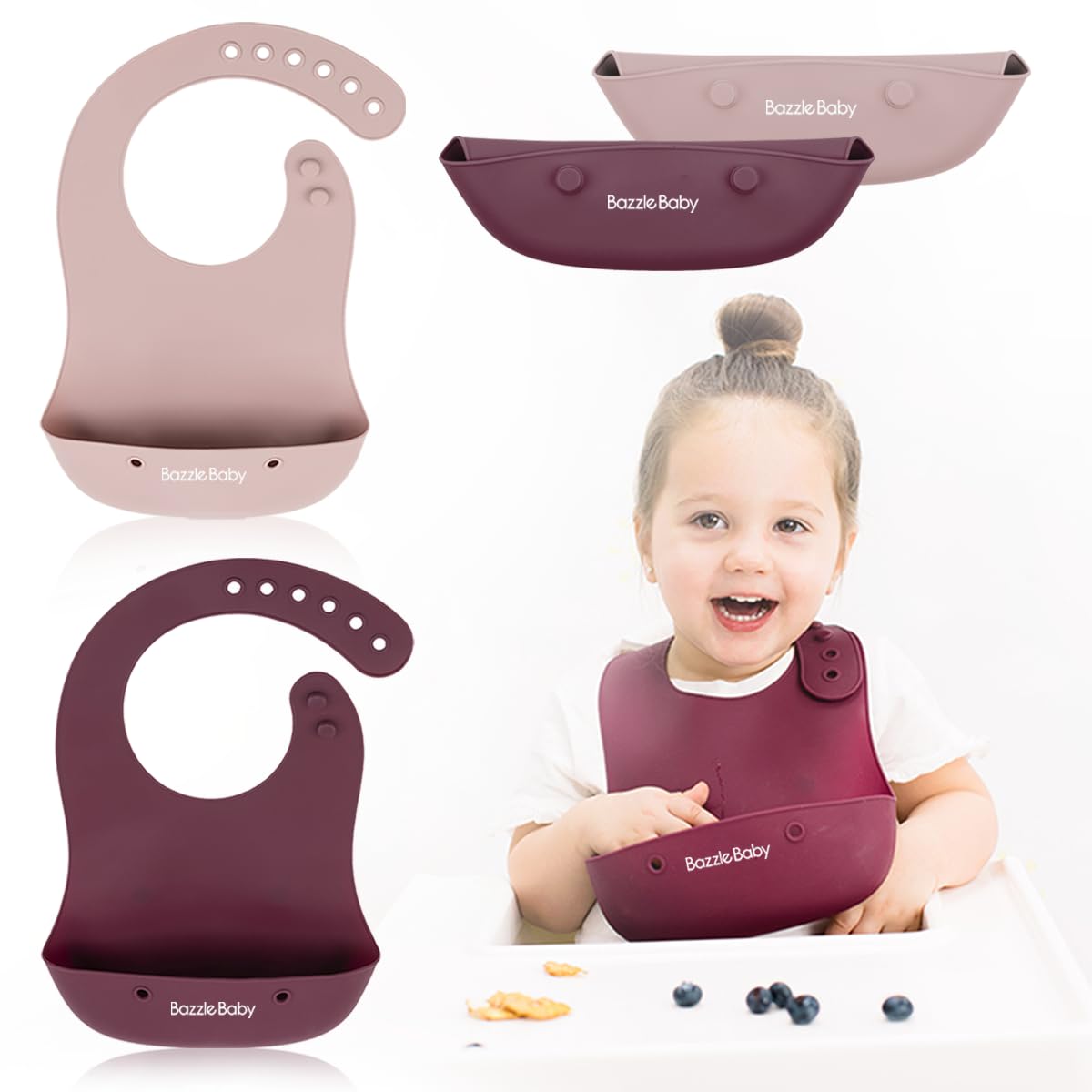 Bazzle Baby Silicone Bibs with Food Catcher - Rolls Up and Button closed for easy travel and storage Waterproof 2-Pk|Baby & Toddler