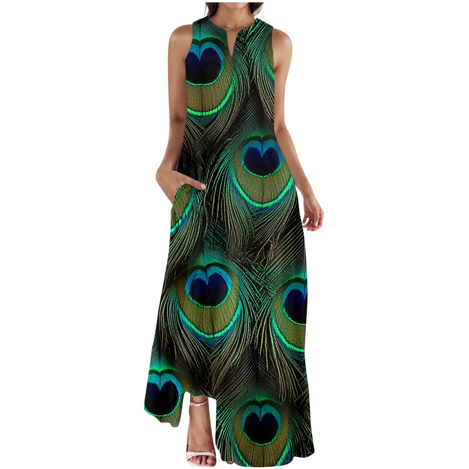 Sundresses for Women 2025 Summer Notch V Neck Sleeveless Beach Maxi Dresses Trendy Floral Long Tank Dress with Pocket|Clothing