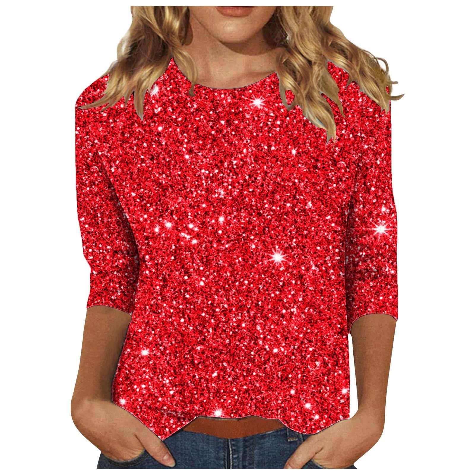 Women's 3/4 Sleeve Tops Trendy Summer 2025 Sequin Floral Print T-Shirts Slim Tunic Crew Neck Blouses Loose Fit Outfits|Clothing