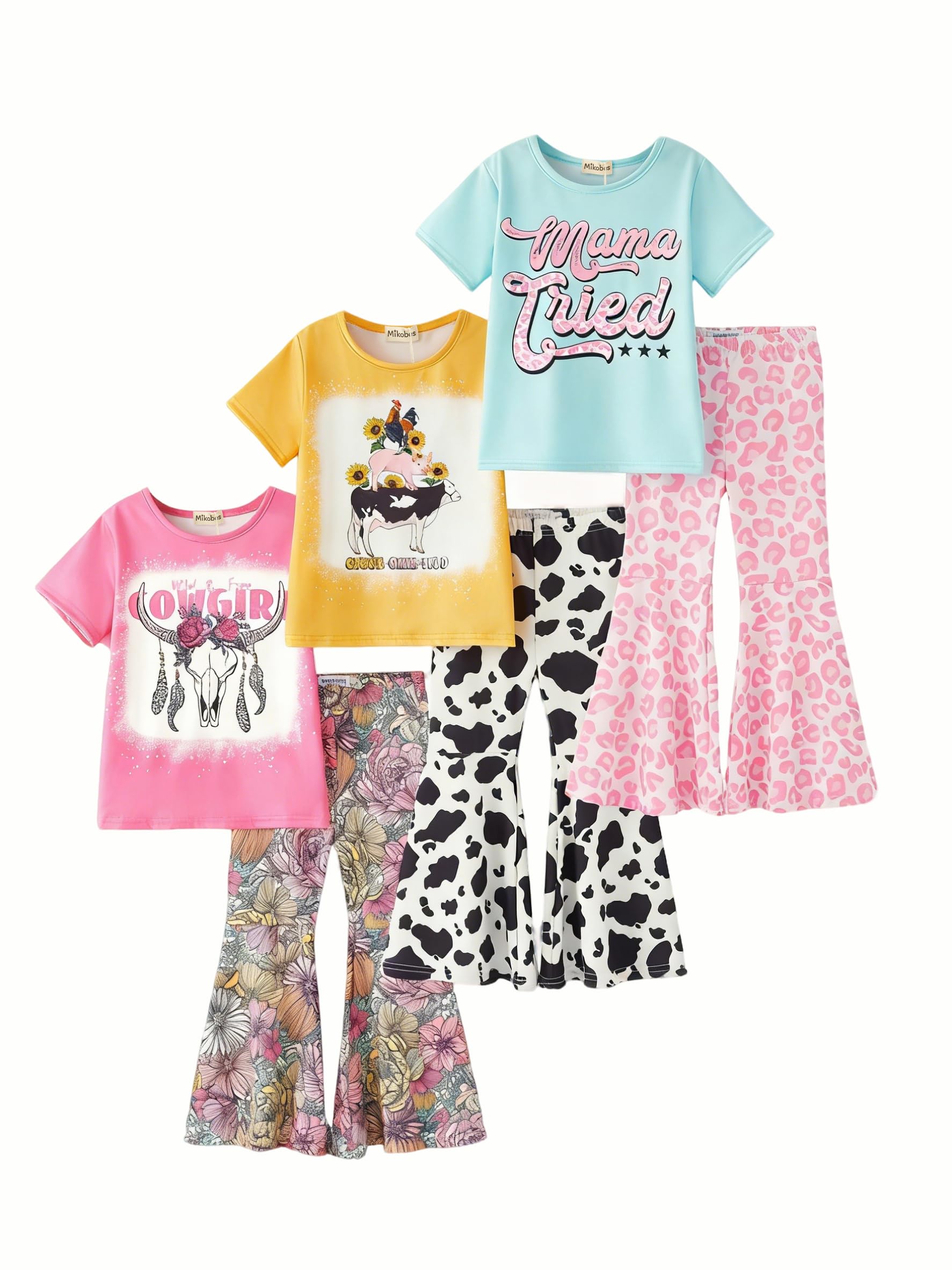 Mikobes Girls Flare Pants Sets, Toddler & Big Kids 2-Piece Graphic Tee and Bell Pants Clothing Set Stretchy Outfits 3-Pack|Clothing