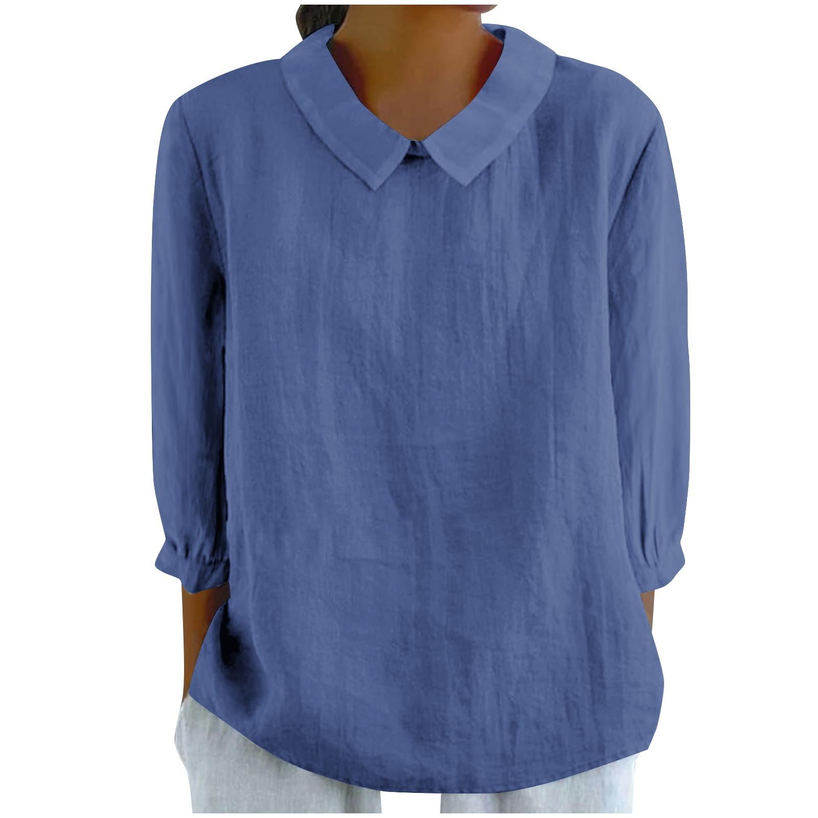 Womens 3/4 Sleeve Linen Shirts Cute Collared Tops Spring Summer Clothes Casual Plain Gauzy Tunic Tshirt Blouses|Clothing