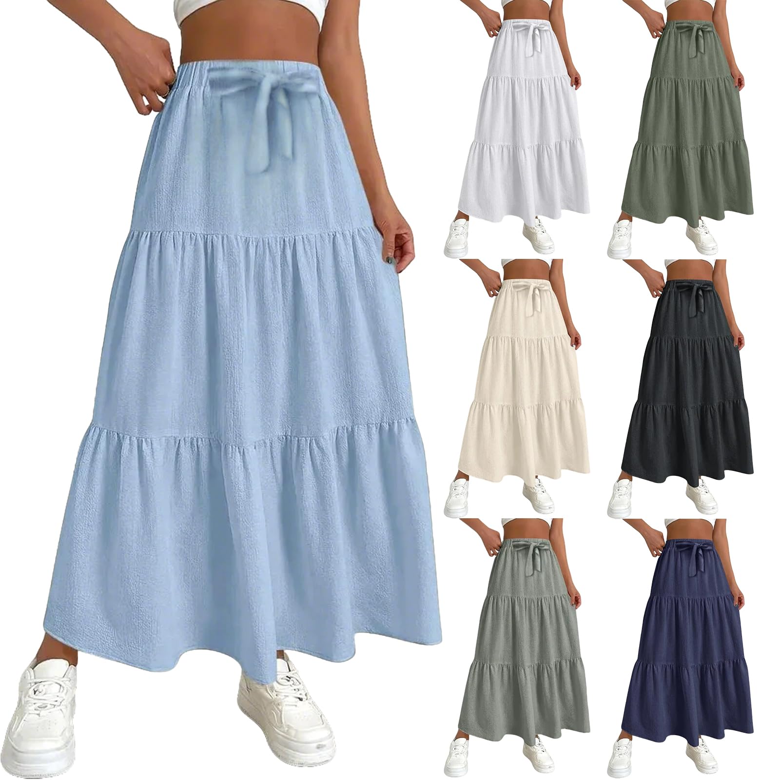 ZsaeSM Linen Maxi Skirts for Women 2025 Summer Boho Long Flowy Skirt Bow Tie Elastic Waist Tiered Swing Pleated A Line Skirt|Clothing