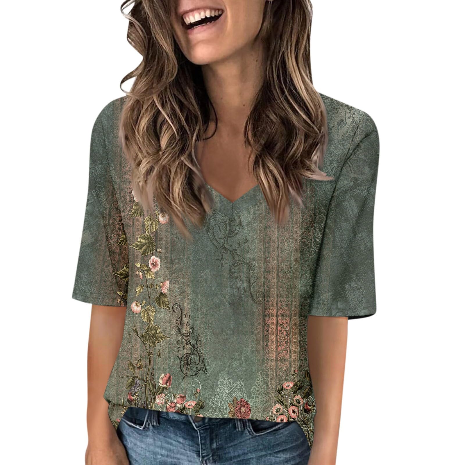 WJDNHKYD Womens 2024 Summer Half Sleeve Tops Casual V Neck Summer Shirts Loose Fit Elbow Length Sleeve Blouses|Clothing