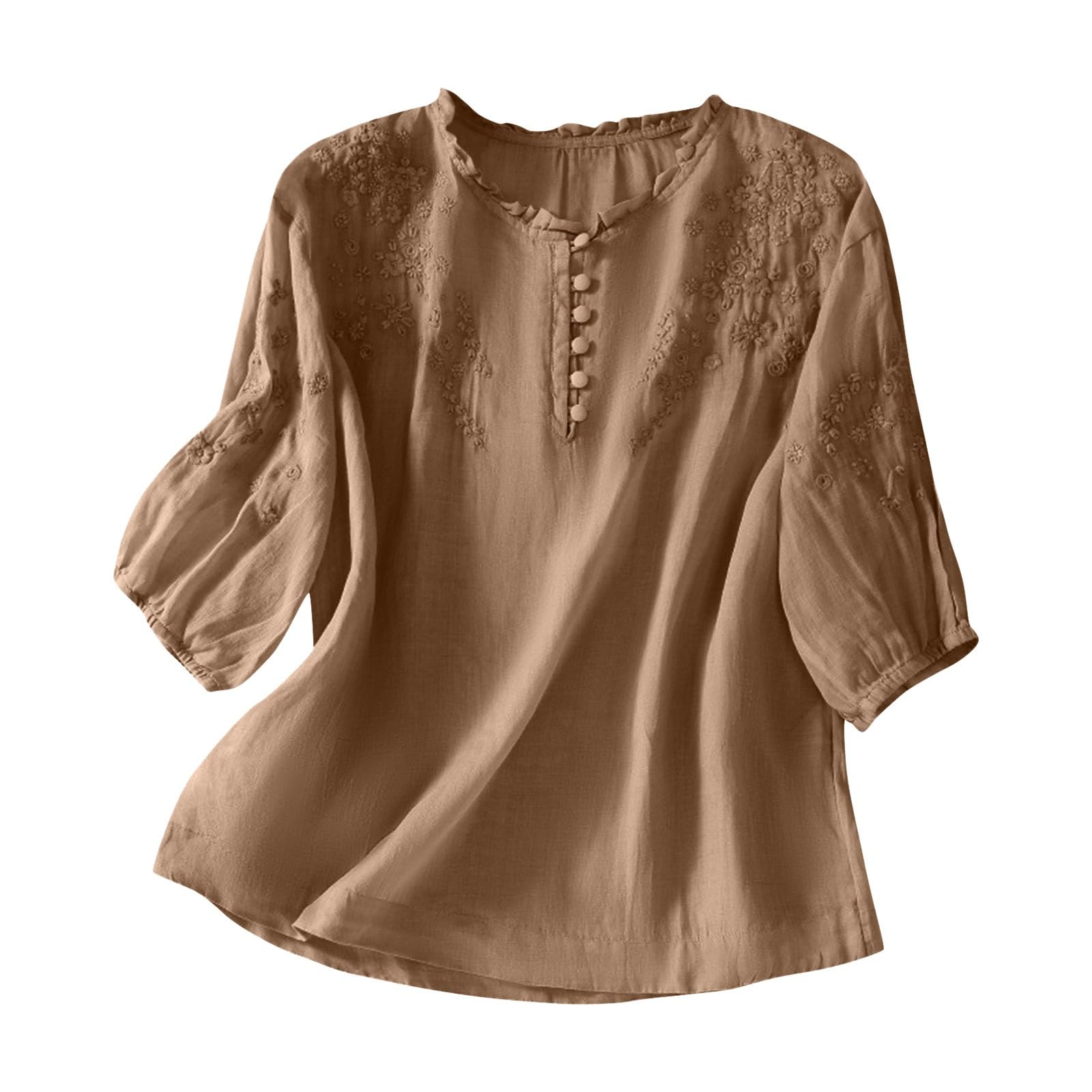 Linen Tops for Women Embroidered Graphic Print T-Shirt Solid Color Short Sleeve Summer Tops Crew Neck Button up Shirt|Clothing