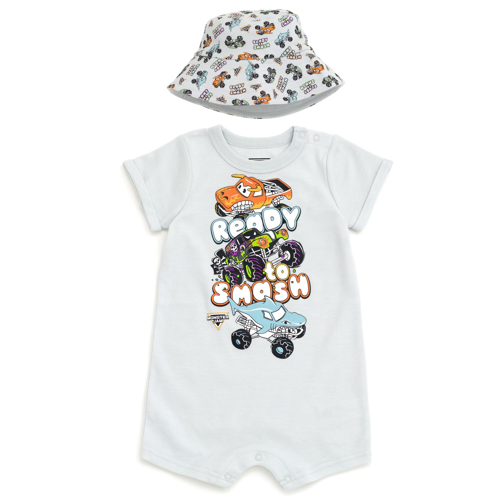 Monster Jam Romper and Bucket Sun Hat Outfit Set Newborn to Toddler Grave Digger El Toro Loco Megalodon|Clothing
