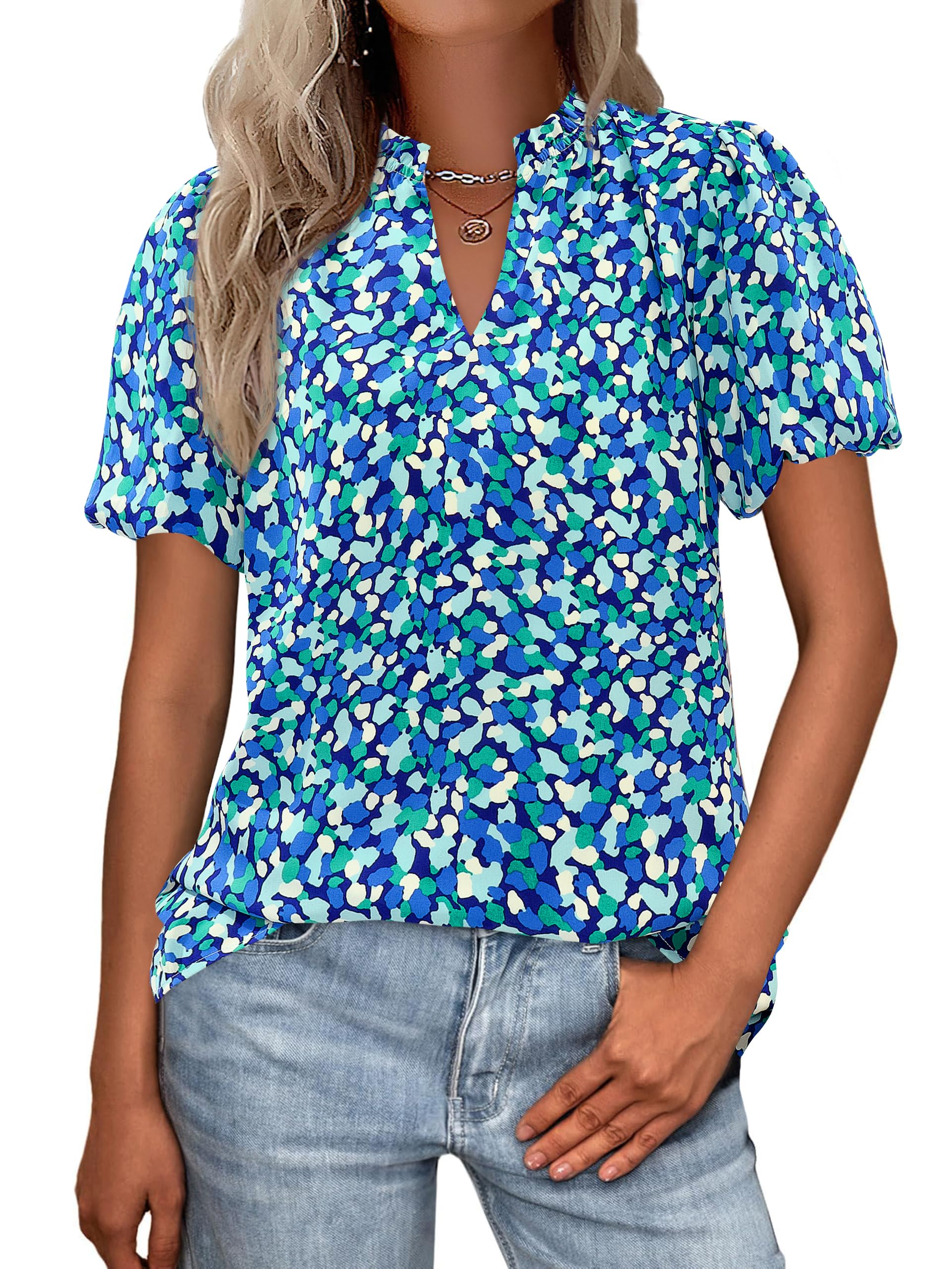 MASCOMODA Boho Short Sleeve Floral Work Blouses for Women Dressy Casual V Neck Puff Sleeve Loose Chiffon Flowy Tops Shirts|Clothing