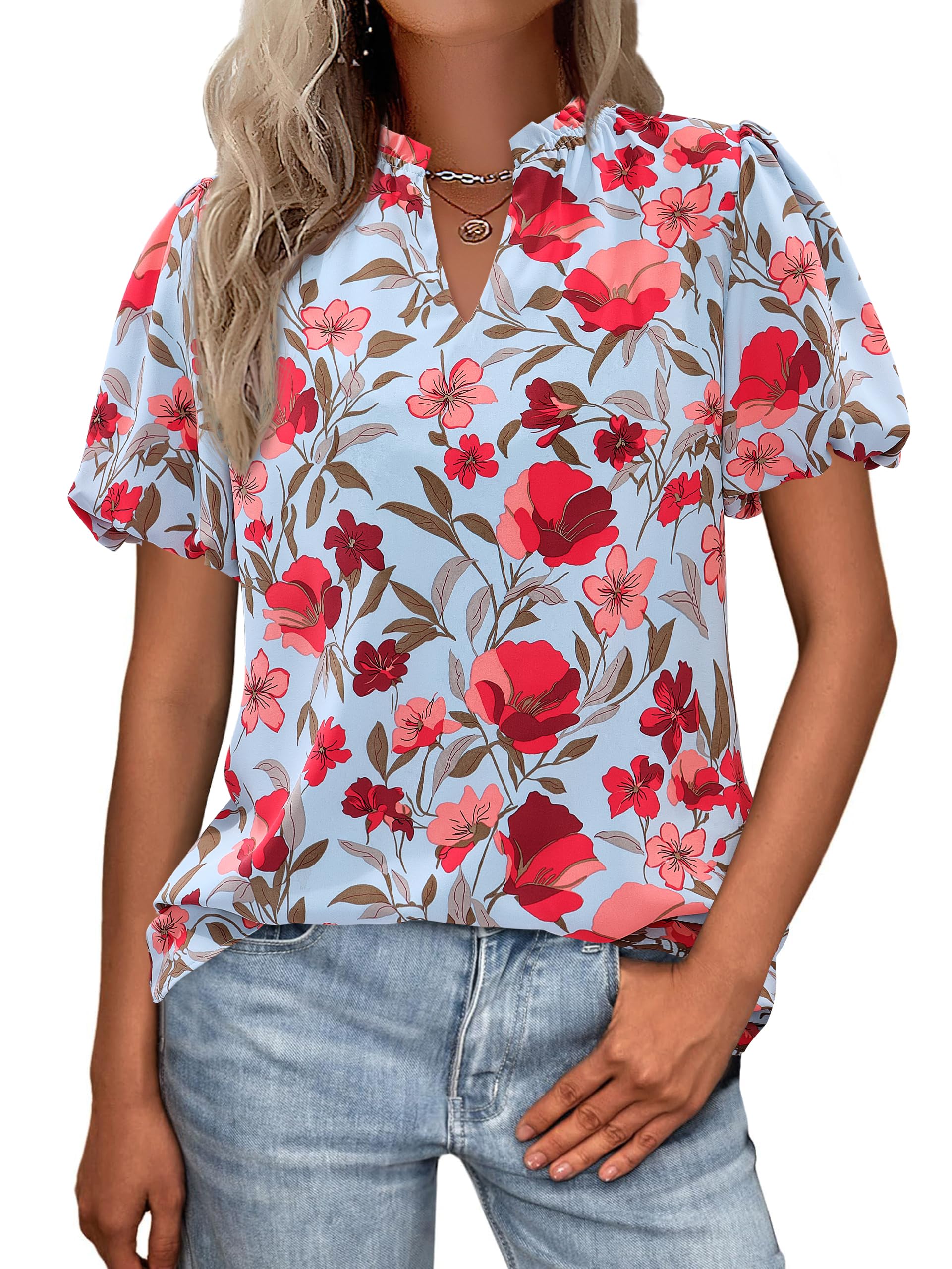 MASCOMODA Boho Short Sleeve Floral Work Blouses for Women Dressy Casual V Neck Puff Sleeve Loose Chiffon Flowy Tops Shirts|Clothing