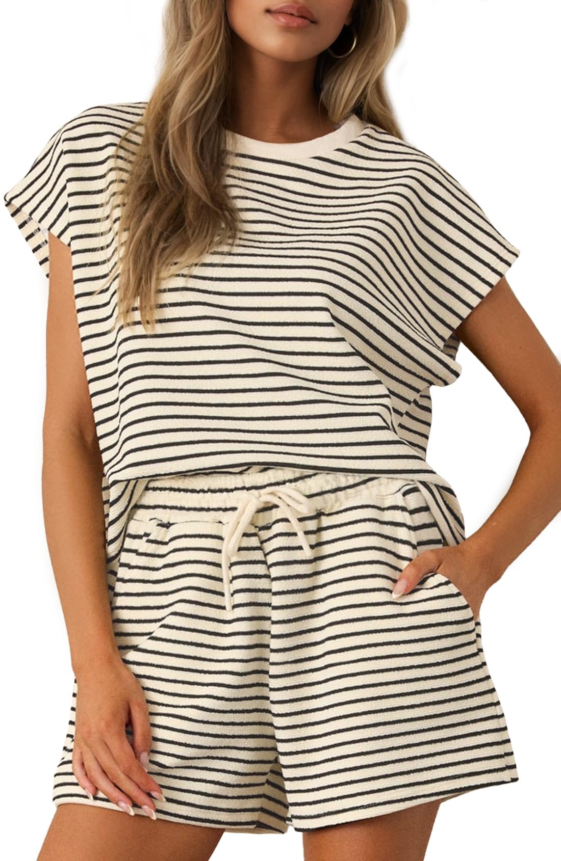 Sweetmoon Two Piece Sets for Women Summer, Striped Matching Pajamas for Women Set Shorts and Top, Travel Lounge Outfits|Clothing