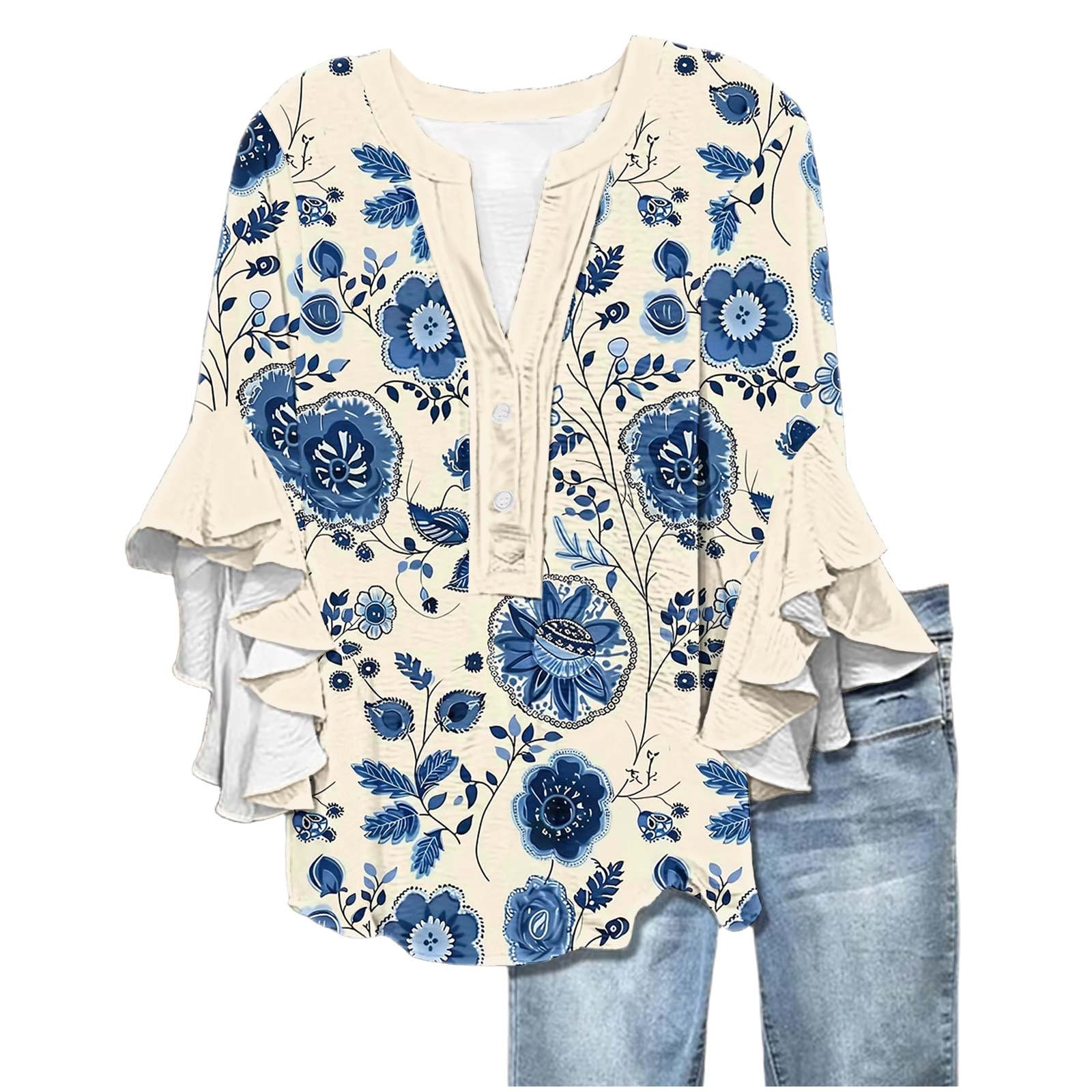 3/4 Length Sleeve Women Tops V Neck Ruffle Shirts Casual Summer Floral Boho Blouses Plus Size Spring Clothes|Clothing