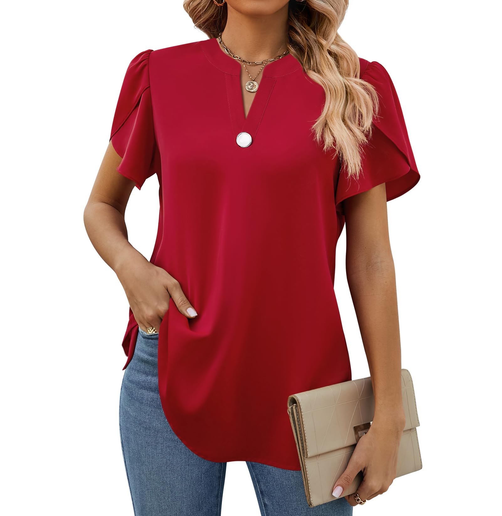 Funlingo Women's Summer Tops Short Sleeve Dressy Chiffon Blouses V Neck Work Tunic Tops Casual Loose T-Shirts|Clothing