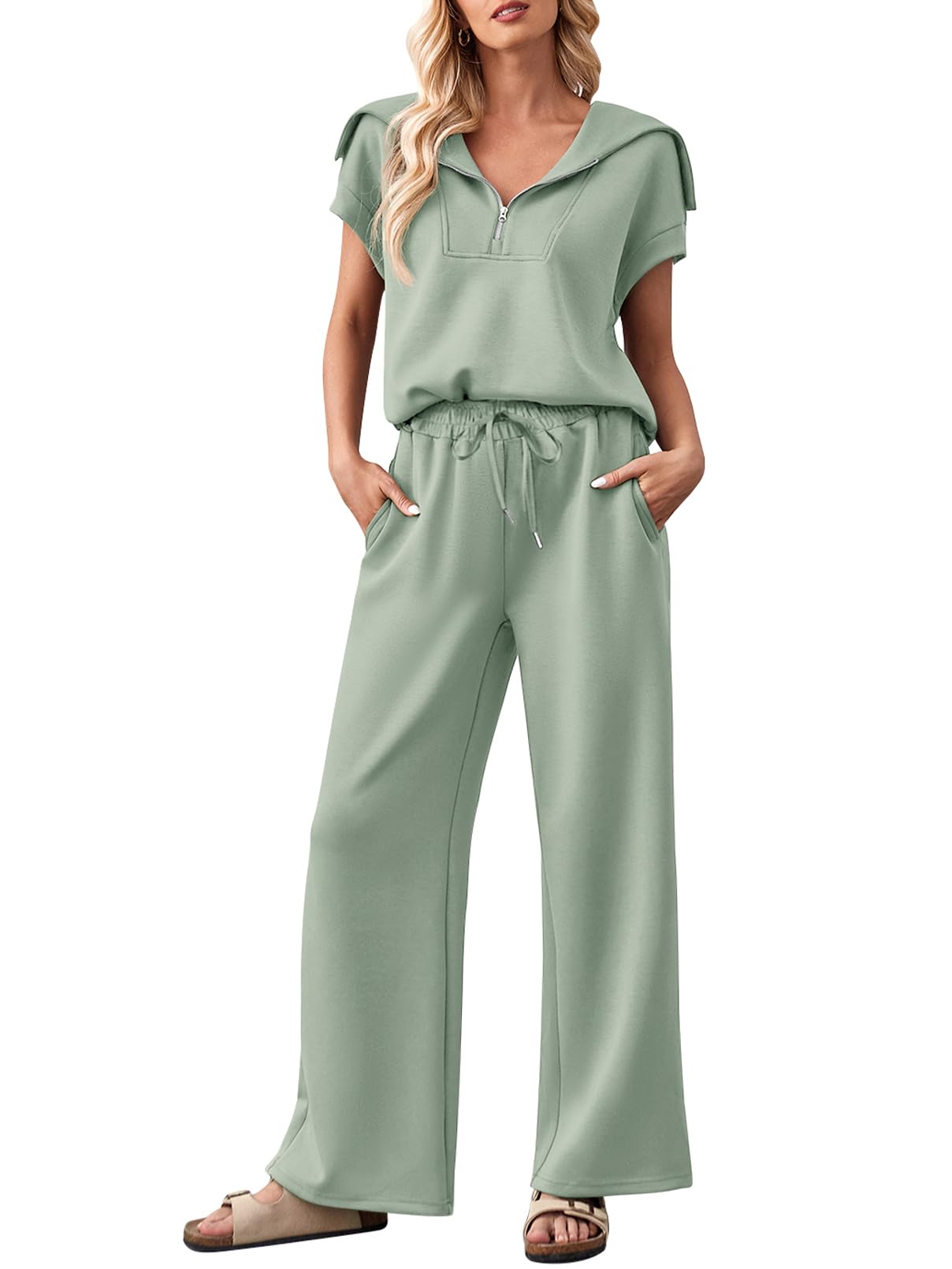 MEROKEETY Women 2 Piece Set Summer Outfits Sweatsuit Half Zip Cap Sleeve Sweatshirt Wide Leg Sweatpant Tracksuit Sets|Clothing