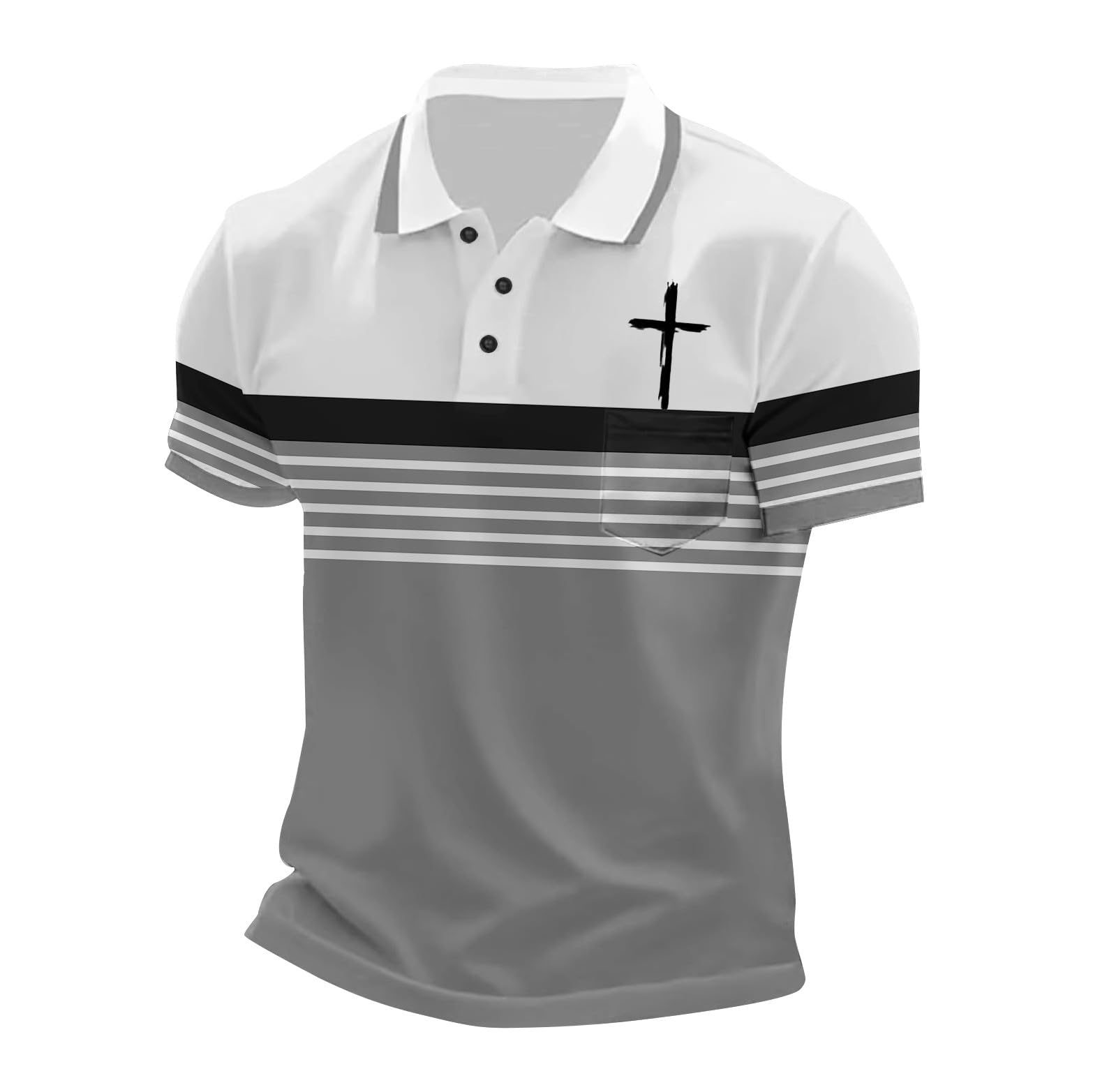 Mens Short Sleeve Polo Shirts Christian Jesus Faith Cross Striped Golf T Shirts with Pocket Button Down Work Tops|Clothing