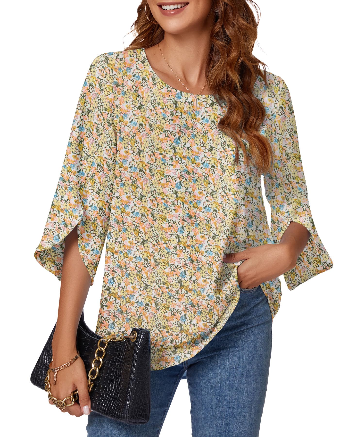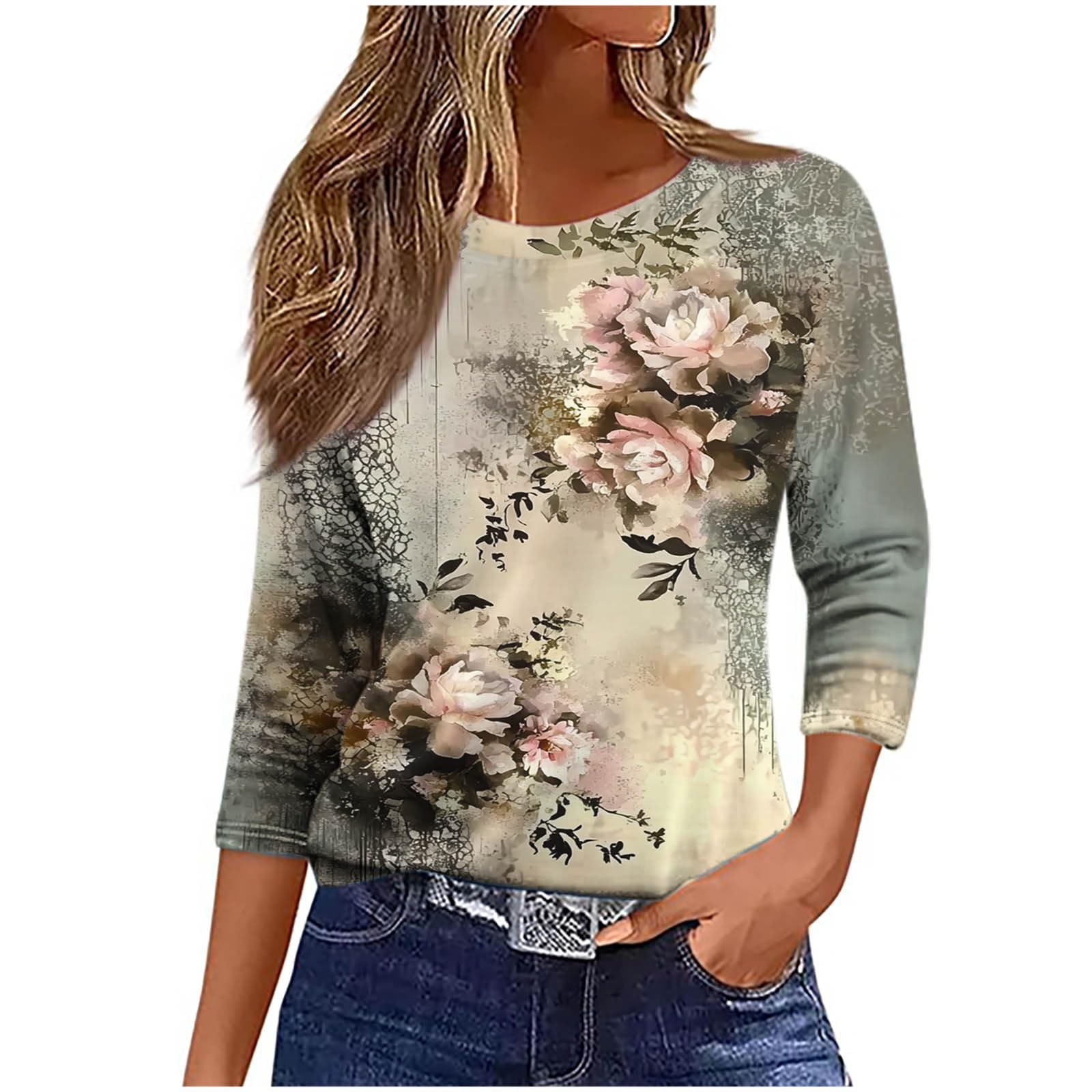 Womens Tops 3/4 Sleeve Shirts Round Neck Cute Tunic Tops Basic Tees Loose Casual Floral Blouses Business Work Tee Top|Clothing