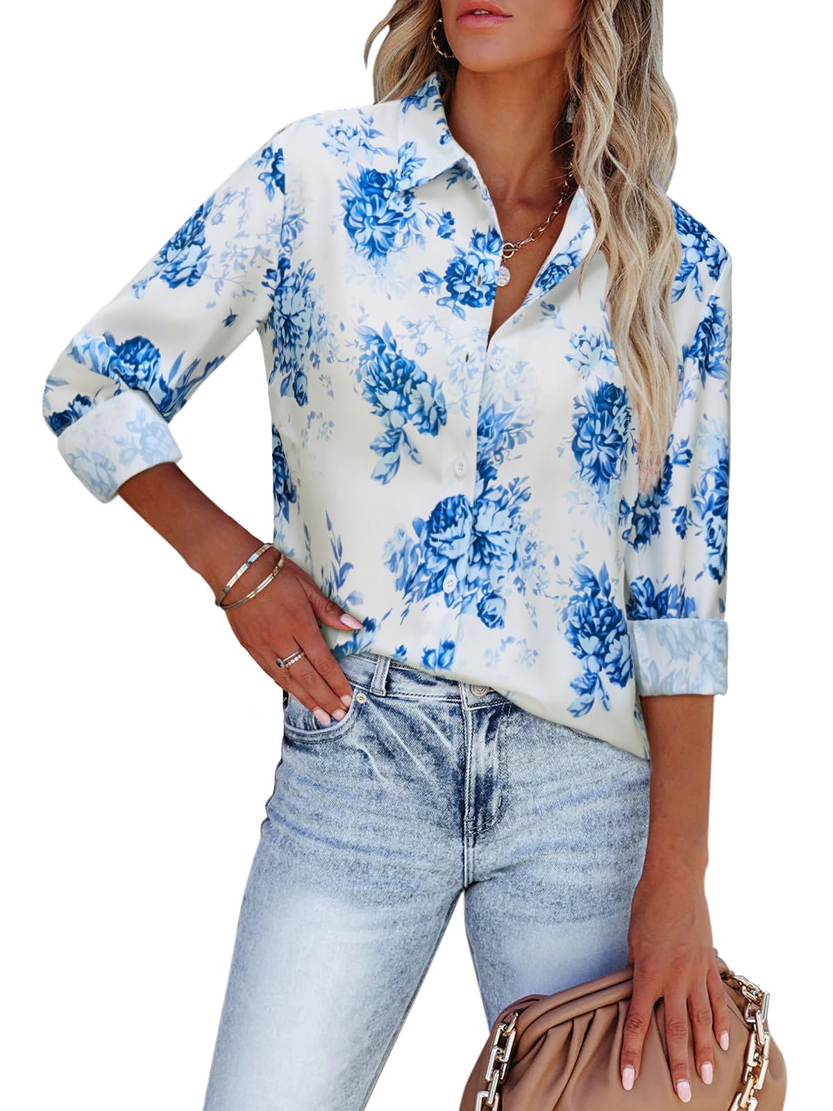siliteelon Blouses for Women Long Sleeve Button Down Shirts Printed Wrinkle-Free Dressy Casual Blouse Spring Fall Trendy|Clothing