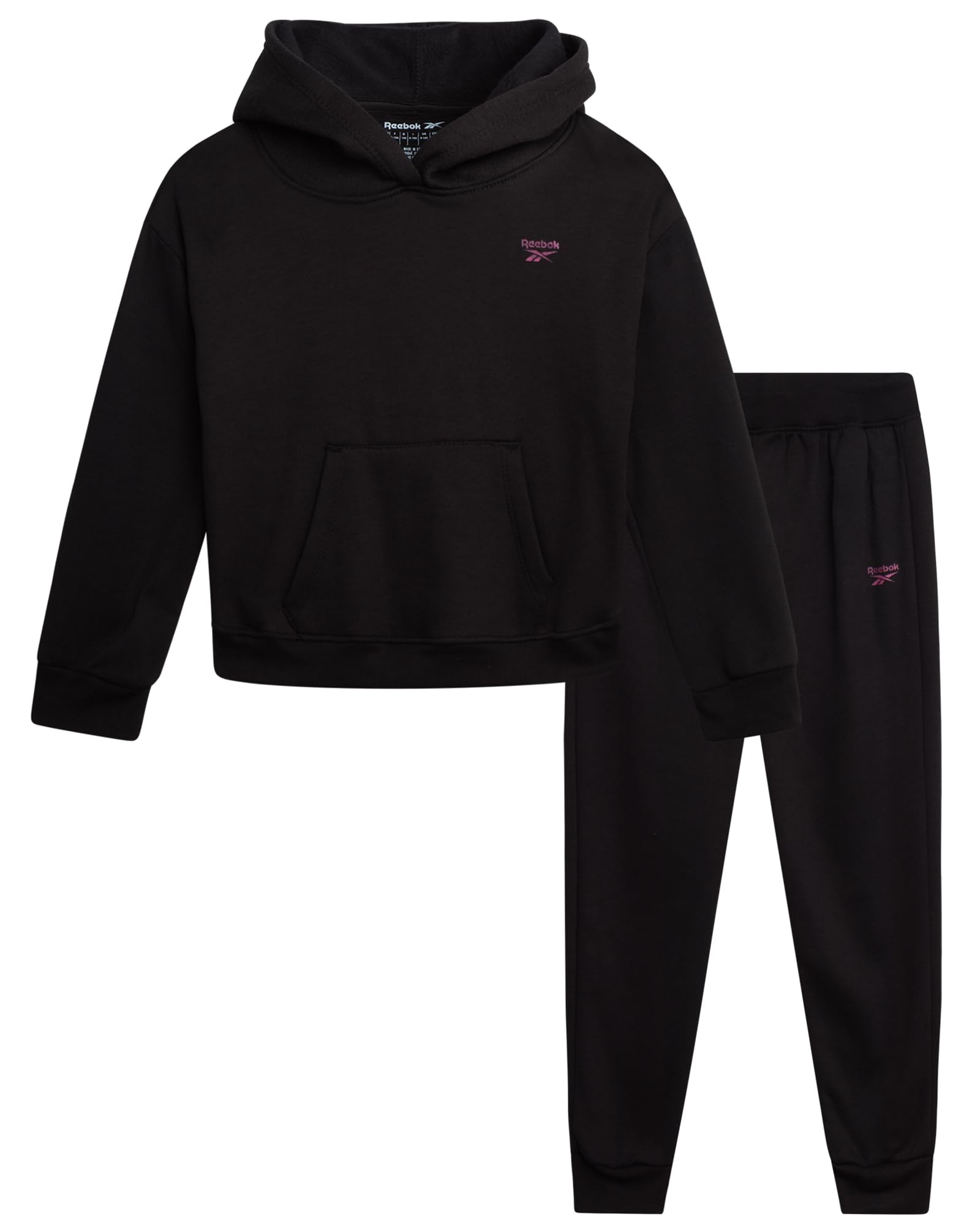 Reebok Girls Sweatsuit Set - 2 Piece Soft Long Sleeve Hoodie Sweatshirt and Sweatpants for Girls - Athletic Sweatsuit, Size 8, Black|Clothing