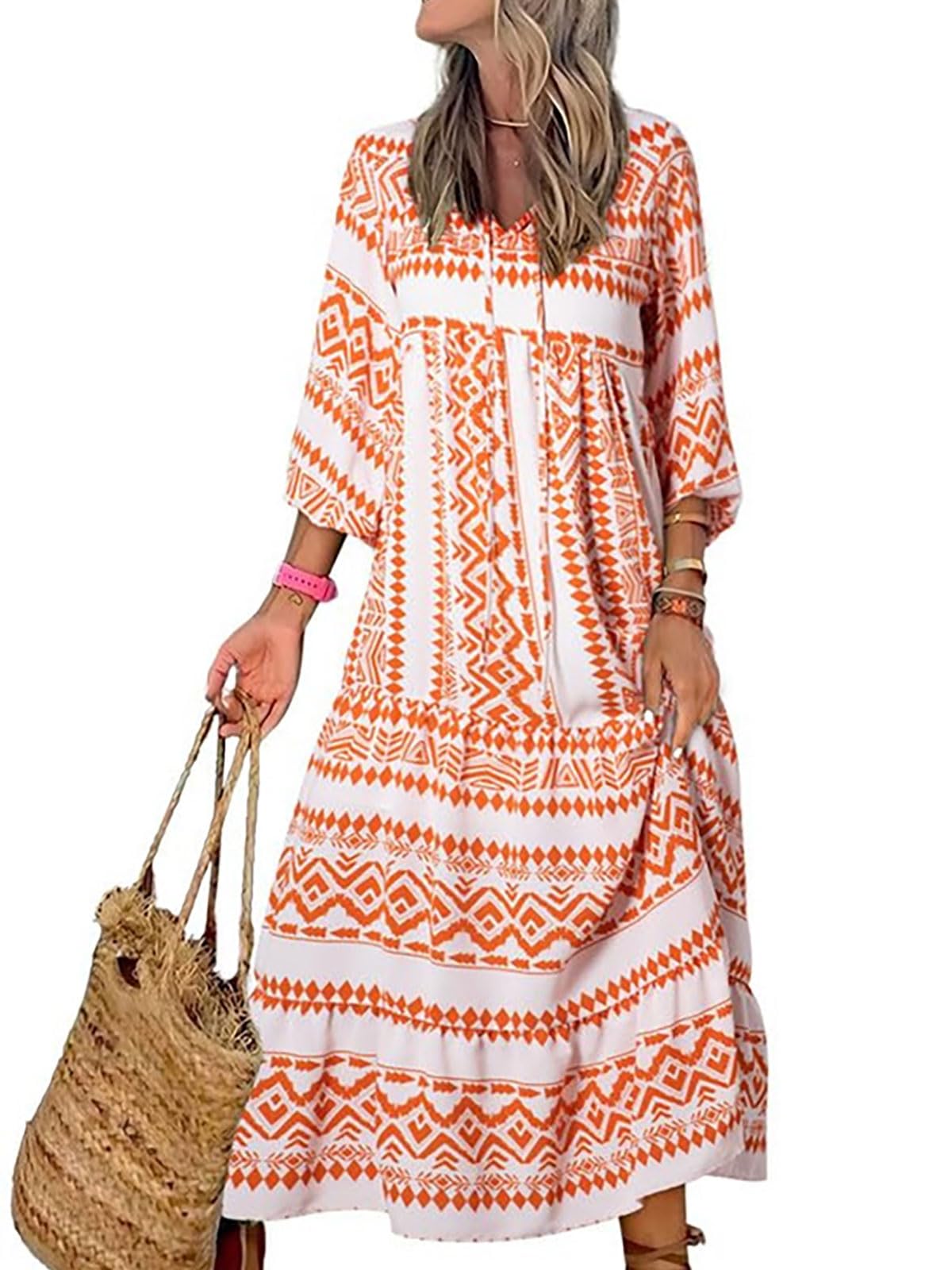 Womens Boho Maxi Dresses 2024 Summer V Neck Puff Sleeve Floral Flowy Swing Casual Long Dress|Clothing