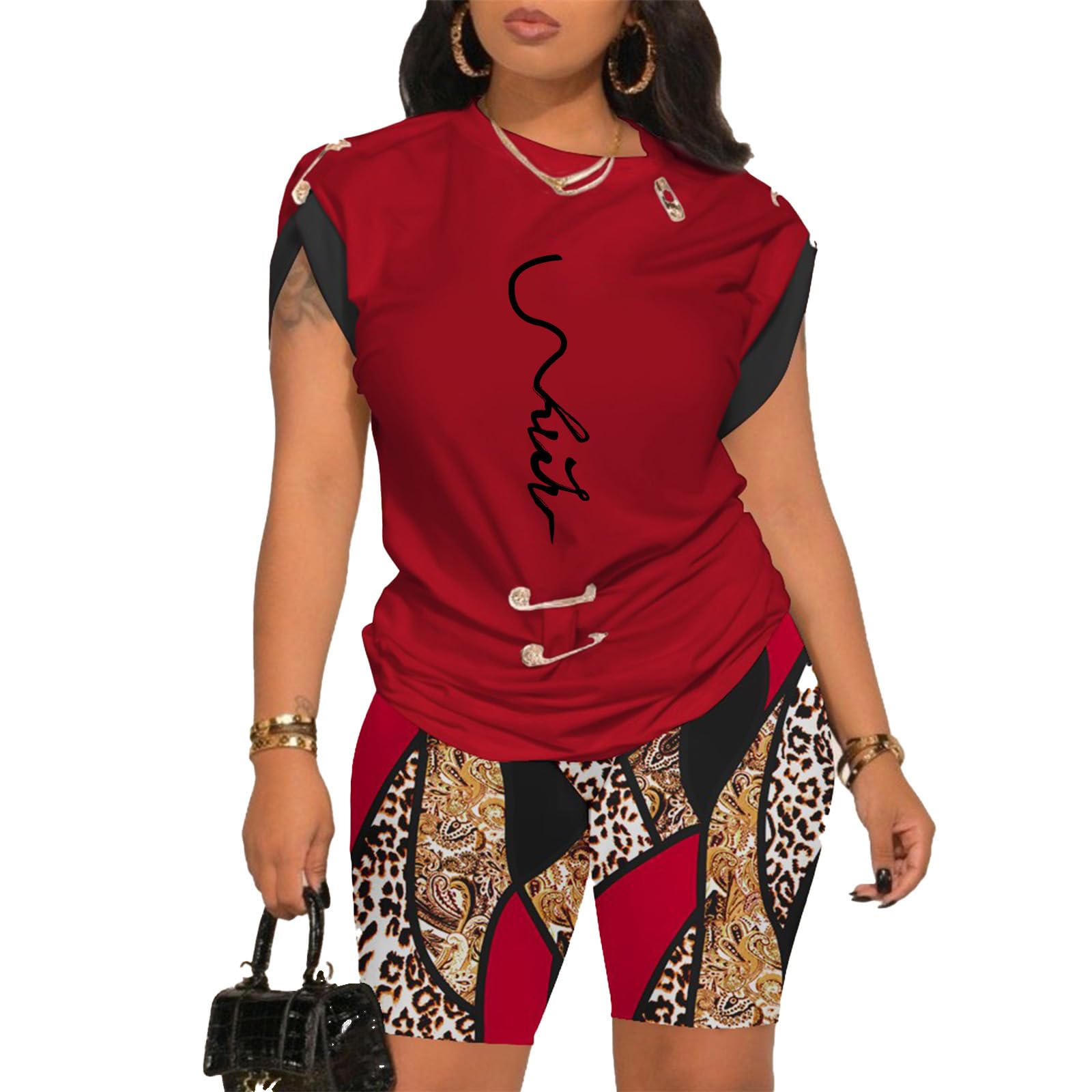 Mandonce Two Piece Outfits for Women Pins Round Neck Printed T-shirt Elastic Shorts Loose Casual Suit|Clothing