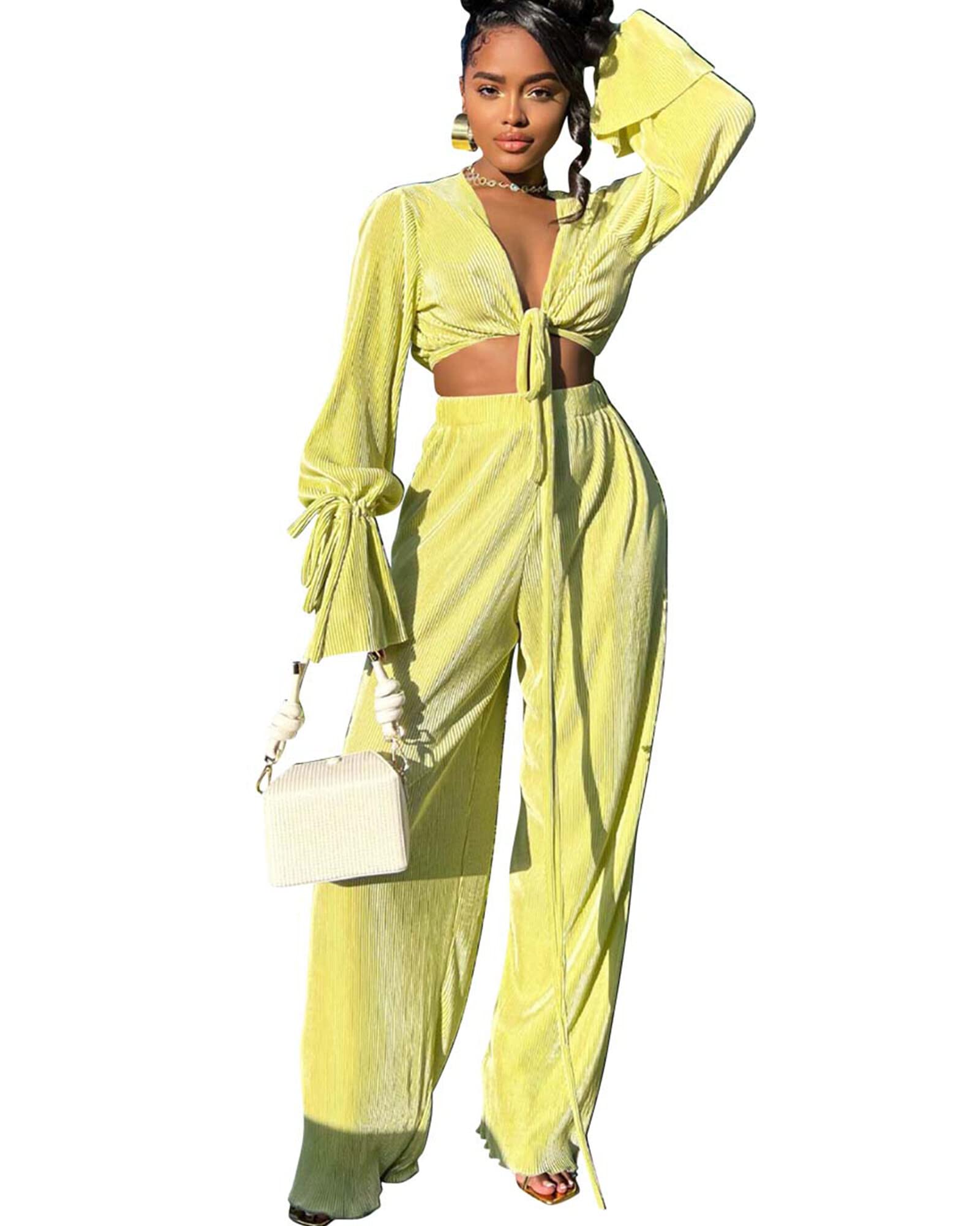 Casual Sexy 2 Piece Outfit for Women Dressy Linen Long Sleeve V Neck Top Y2K Flare Pleated Wide Leg Pants Sets Beach Vacation|Clothing