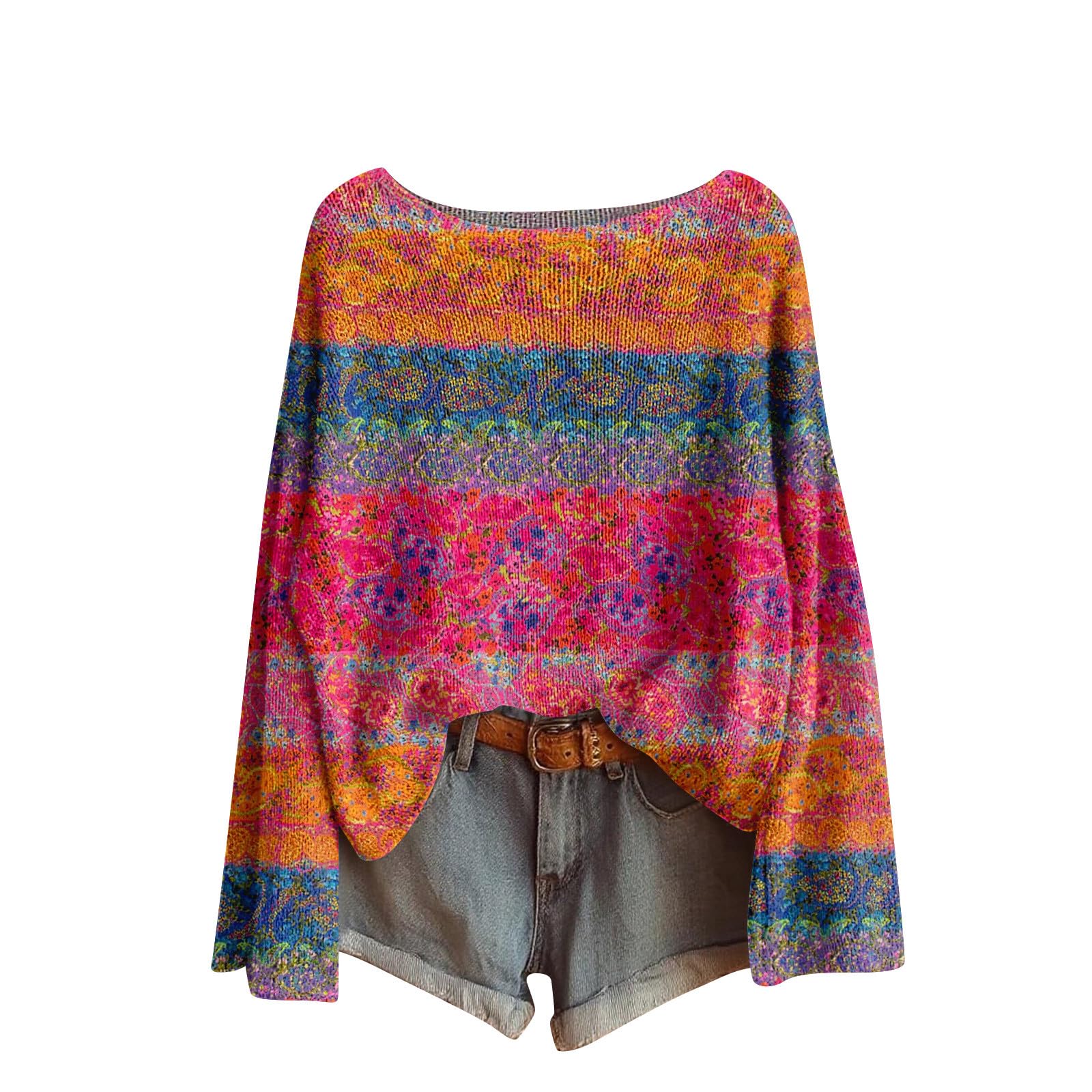 Womens 2025 Fall Sweaters Long Sleeve Crew Neck Pullover Soft Floral Printed Knitted Oversized Loose Fit Jumper Tops|Clothing
