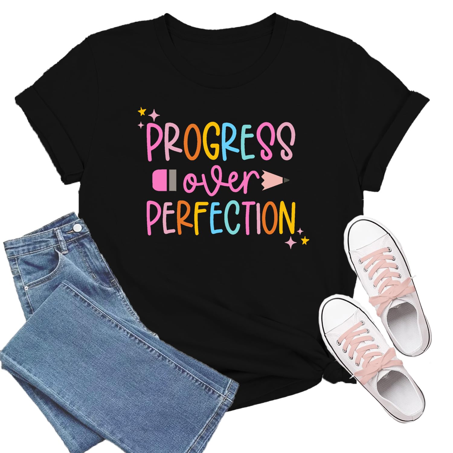 TIEEI Teacher Shirts for Women Teaching T-Shirt Progress Over Perfection Tee Tops|Clothing