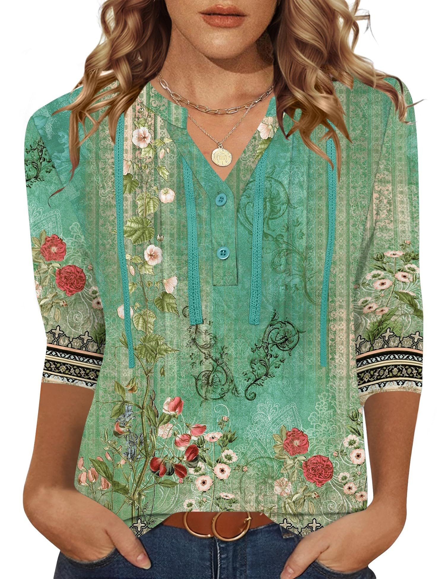 Rapbin 3/4 Length Sleeve Womens Tops Summer V Neck Lace Pleated Button Down Blouses Dressy Casual Elegant Tunic Shirts|Clothing