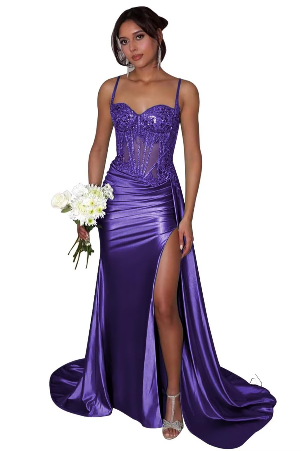 Lindo Noiva Prom Dress Long Ball Gown with Lace Appliques Spaghetti Straps Satin Mermaid Evening Gowns for Women Formal Purple 6|Clothing