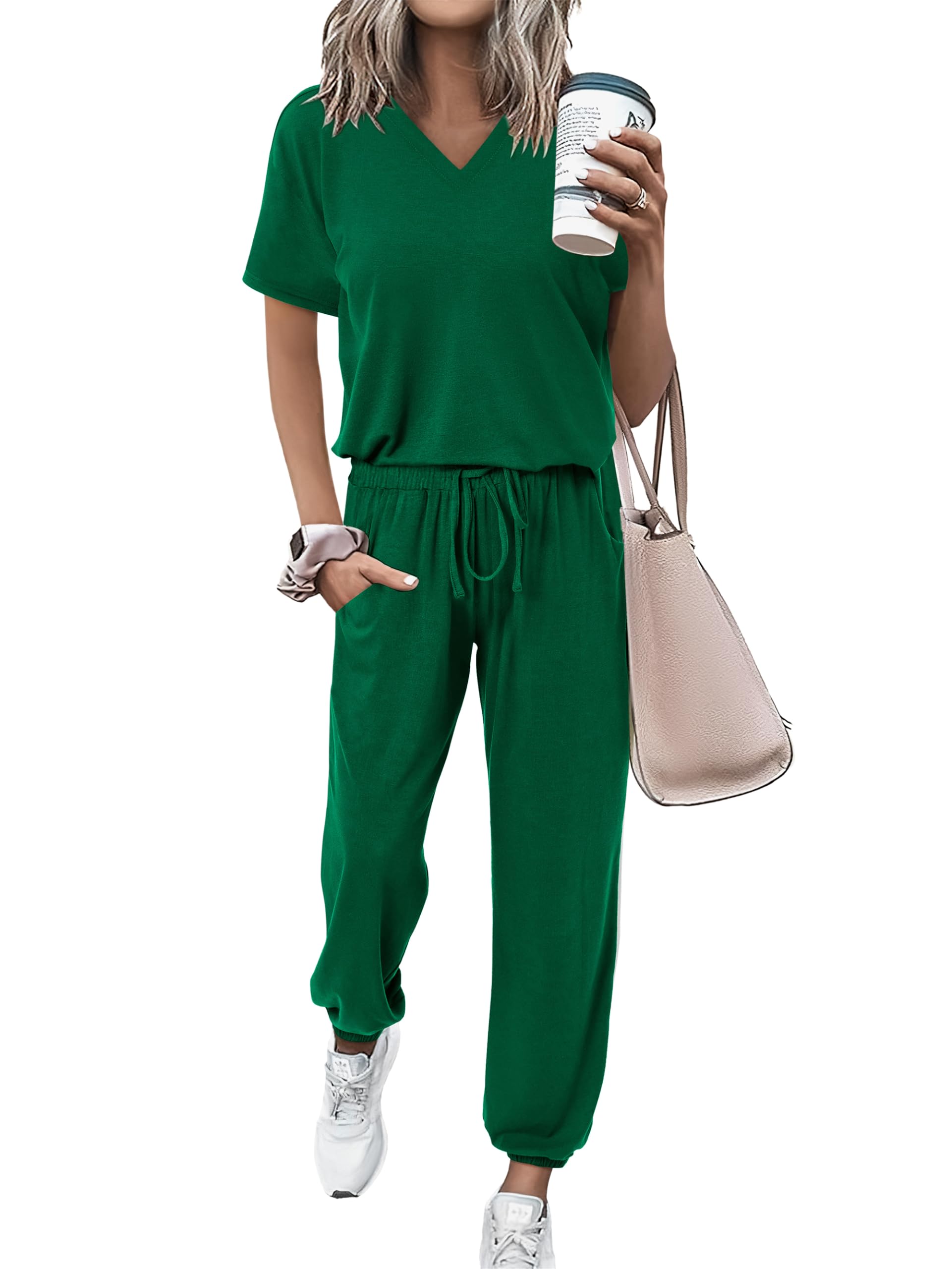 MASCOMODA Womens 2 Piece Outfits Summer Casual V Neck Short Sleeve Tops Long Pants Tracksuit Lounge Jogger Set with Pockets|Clothing