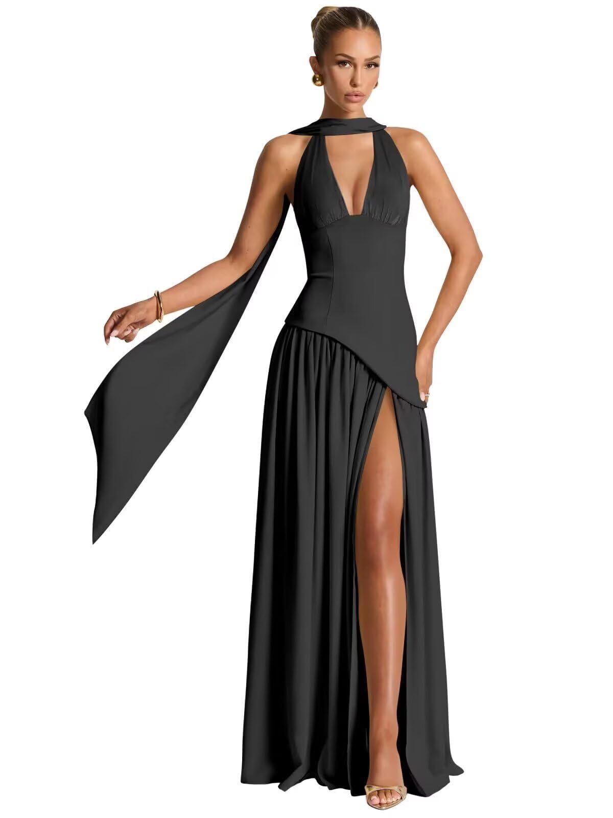RSOETOO Simple V Neck Scarf Bridesmaid Dresses Long for Women 2026 Split Formal Party Gowns with Scarf Black US12|Clothing