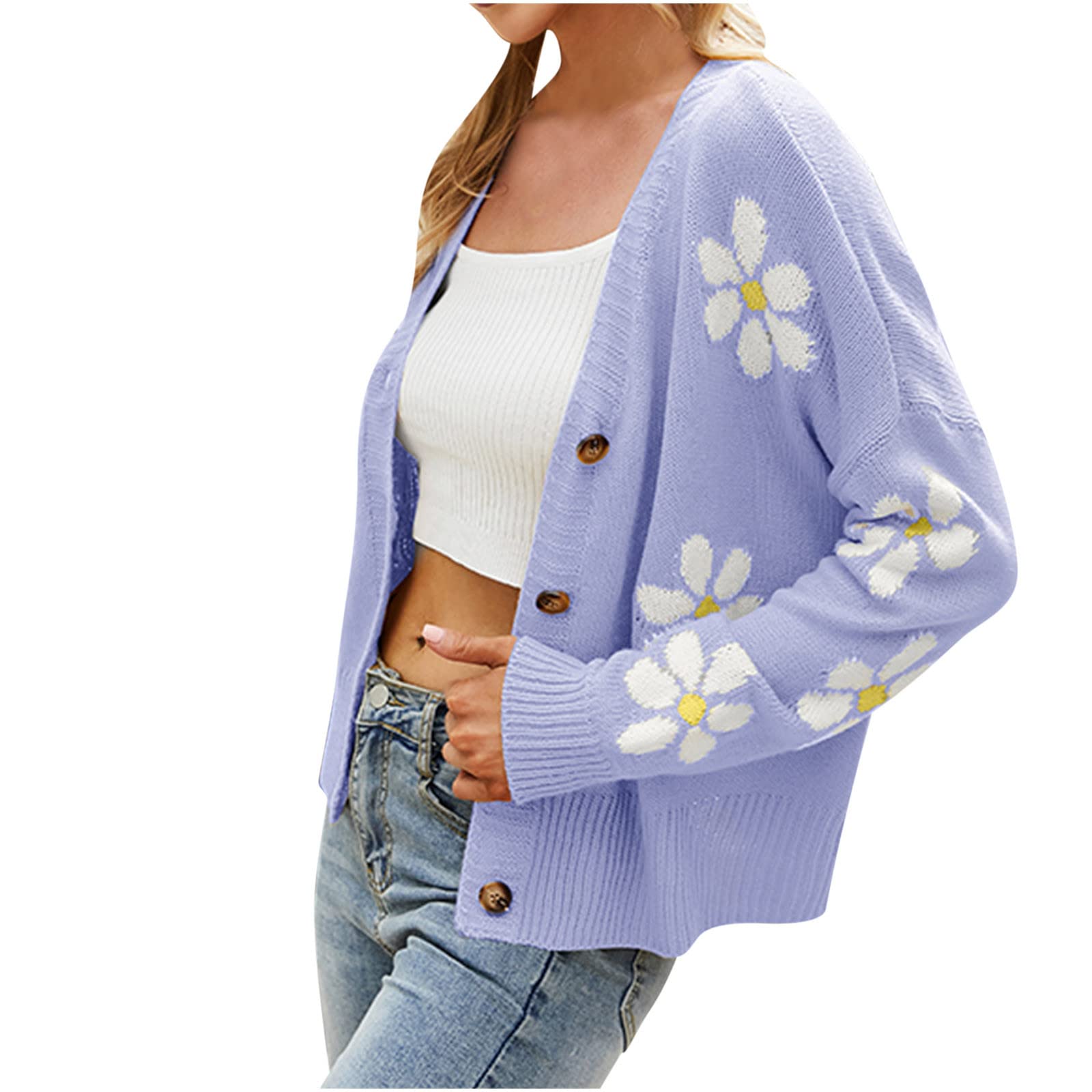 Knitted Sweater Cardigan for Women Daisy Flower Print Long Sleeve Sweaters Button Down Lightweight Y2K Tops Outwear|Clothing