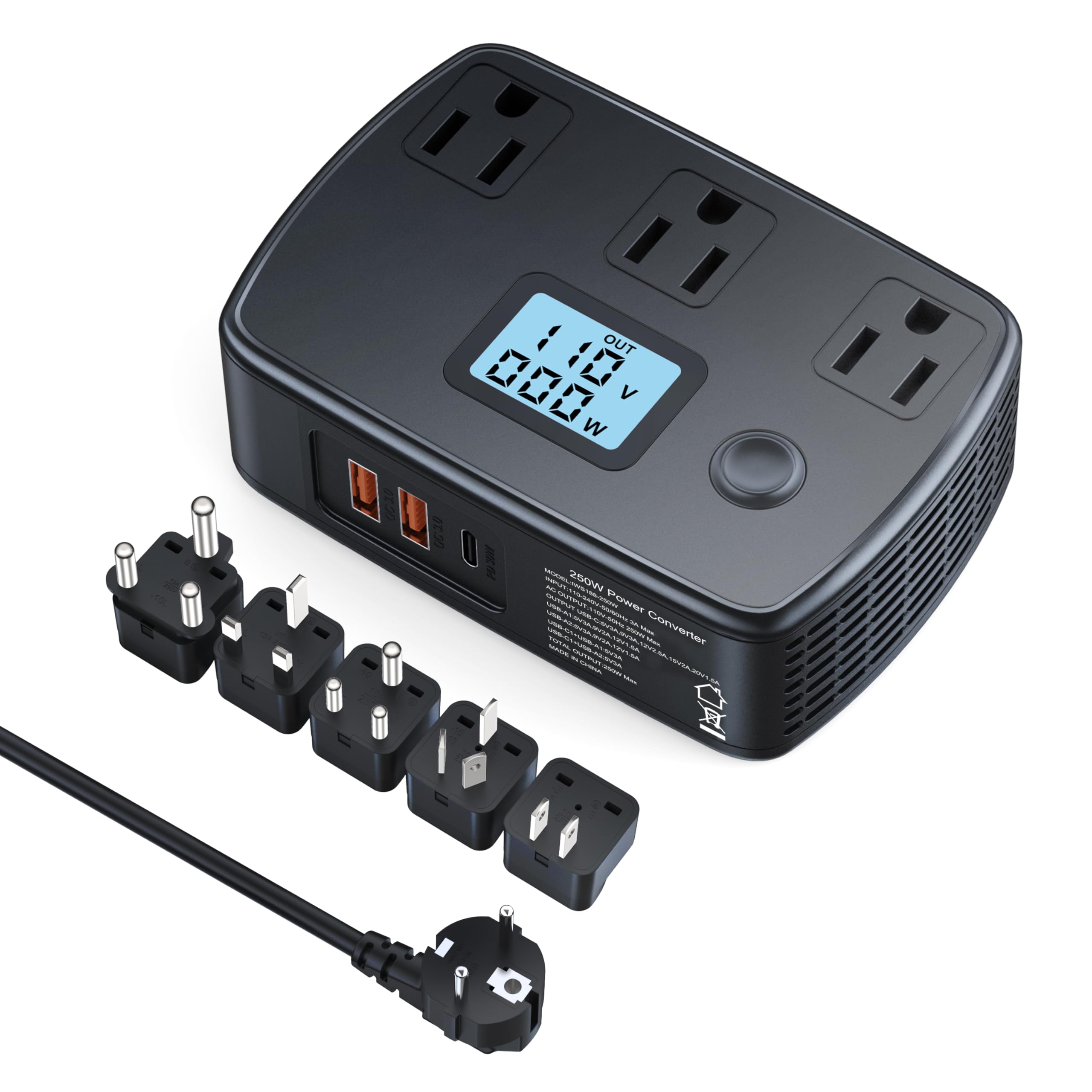 Voltage Converter US to Europe 220v to 110v Converter with PD30W and LCD Display, 250W Step Down Converter Travel Power Converter Adapter Combo for EU|Electronics