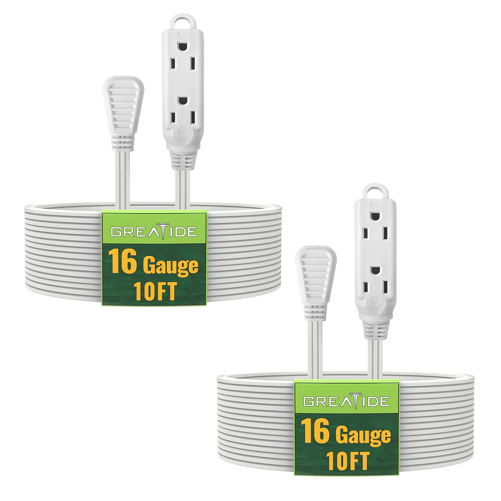 GREATIDE 10 Ft 3 Outlet Indoor Extension Cord with Flat Plug, 3 Prong Grounded 16/3 SPT-3 Power Cable with Multi Outlet Plug, White, 2 Pack|Electronics