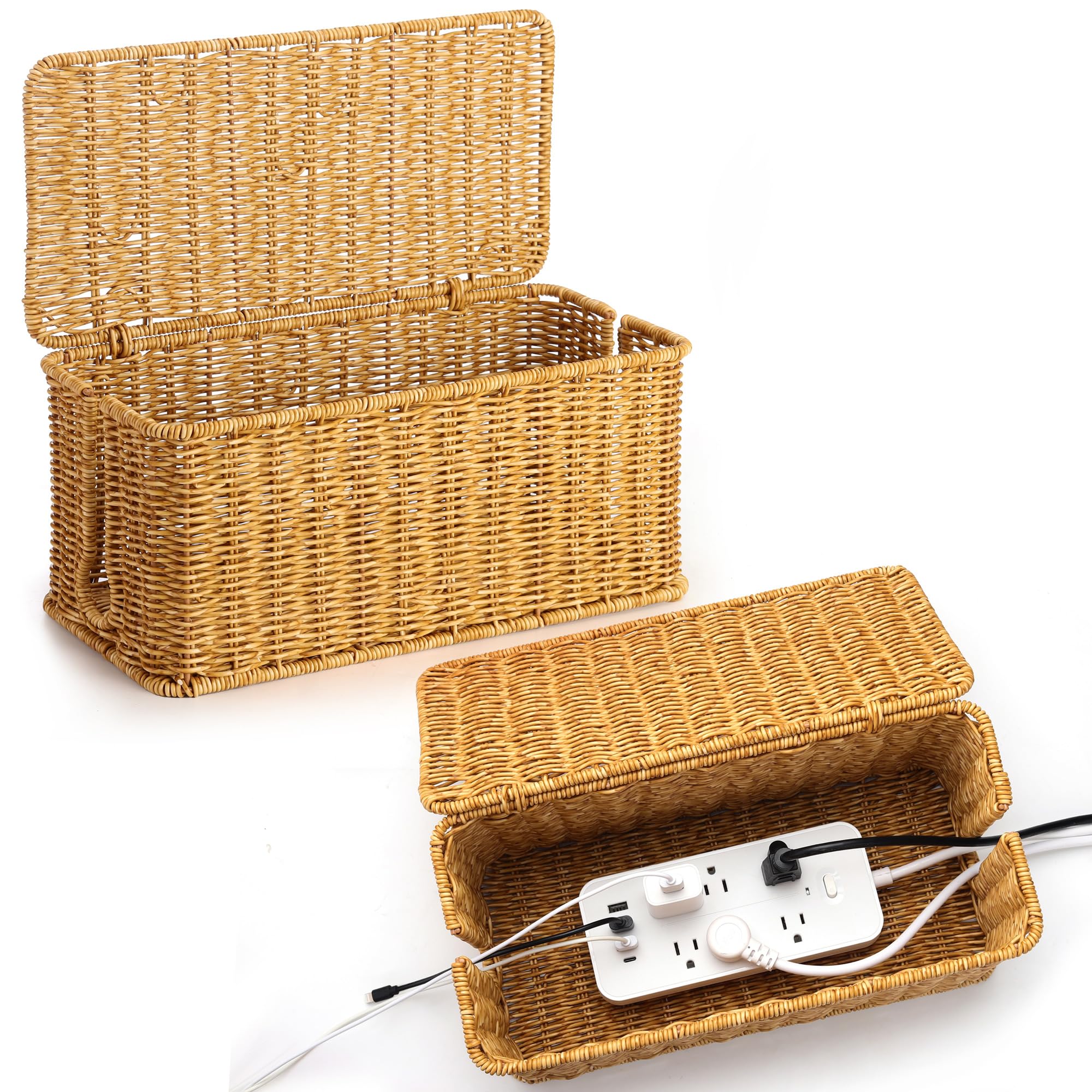 Large Cable Management Box, Handwoven Imitation Rattan Cord Organizer Cord Hider Box, Desk Cord Management Box to Hide Cords and Power Strips, 13.5" L|Electronics
