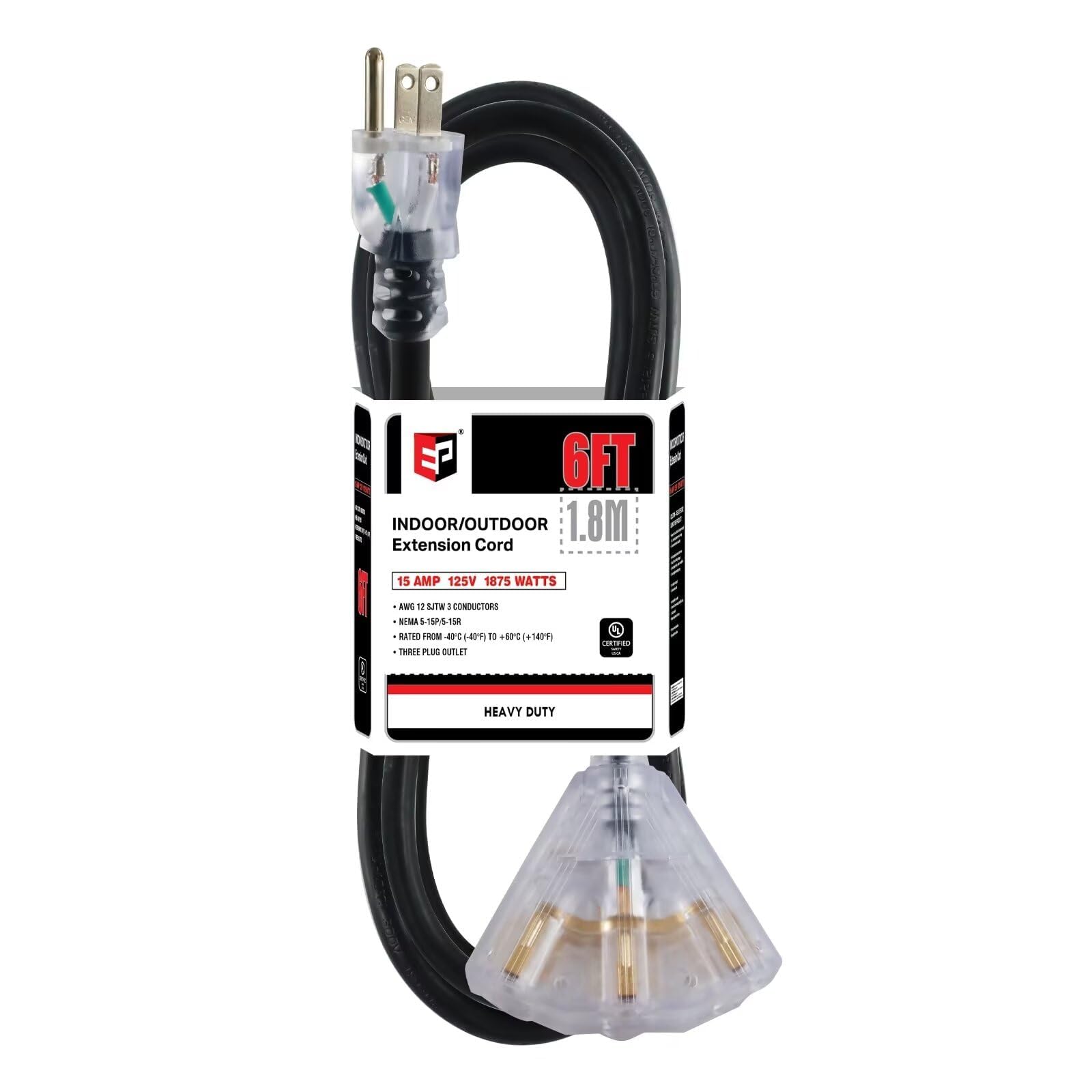 EP 6 Ft 12 Gauge Heavy Duty Extension Cord, 15A 125V 1875W, 3 Outlet Indoor/Outdoor Power Cord with Lighted End, 12/3 SJTW Weatherproof Black, UL|Electronics