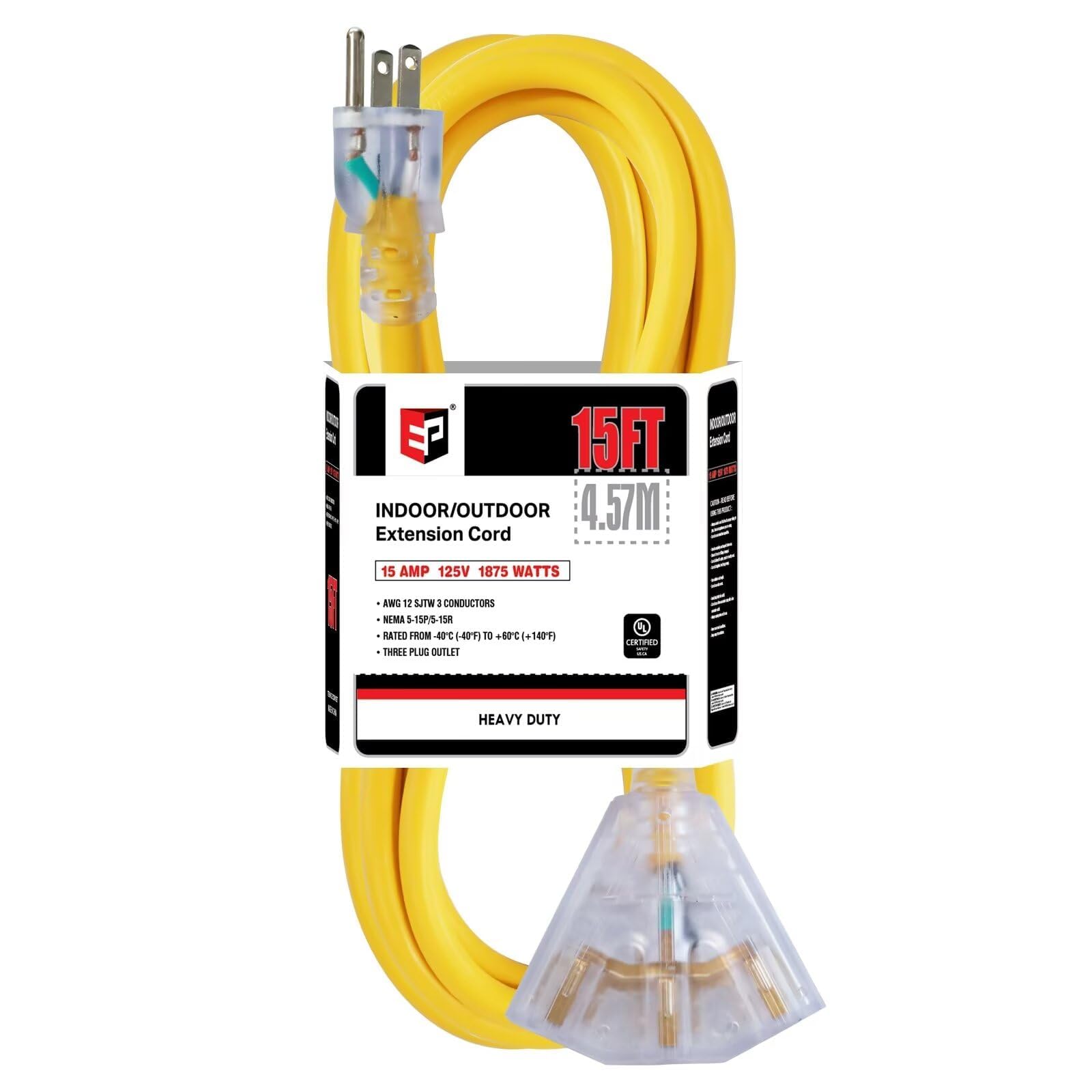 EP 15 Ft 12 Gauge Heavy Duty Extension Cord, 15A 125V 1875W, 3 Outlet Indoor/Outdoor Power Cord with Lighted End, 12/3 SJTW Weatherproof Yellow, UL|Electronics