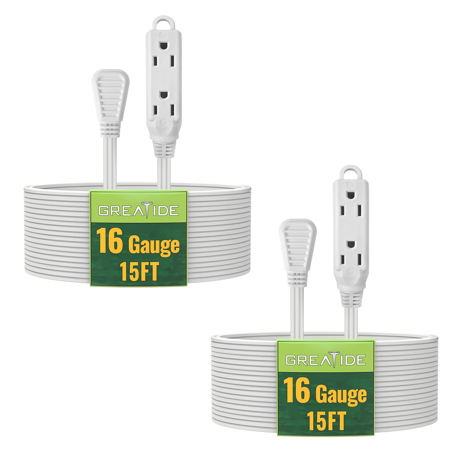 GREATIDE 15 Ft 3 Outlet Indoor Extension Cord with Flat Plug, 3 Prong Grounded 16/3 SPT-3 Power Cable with Multi Outlet Plug, White, 2 Pack|Electronics