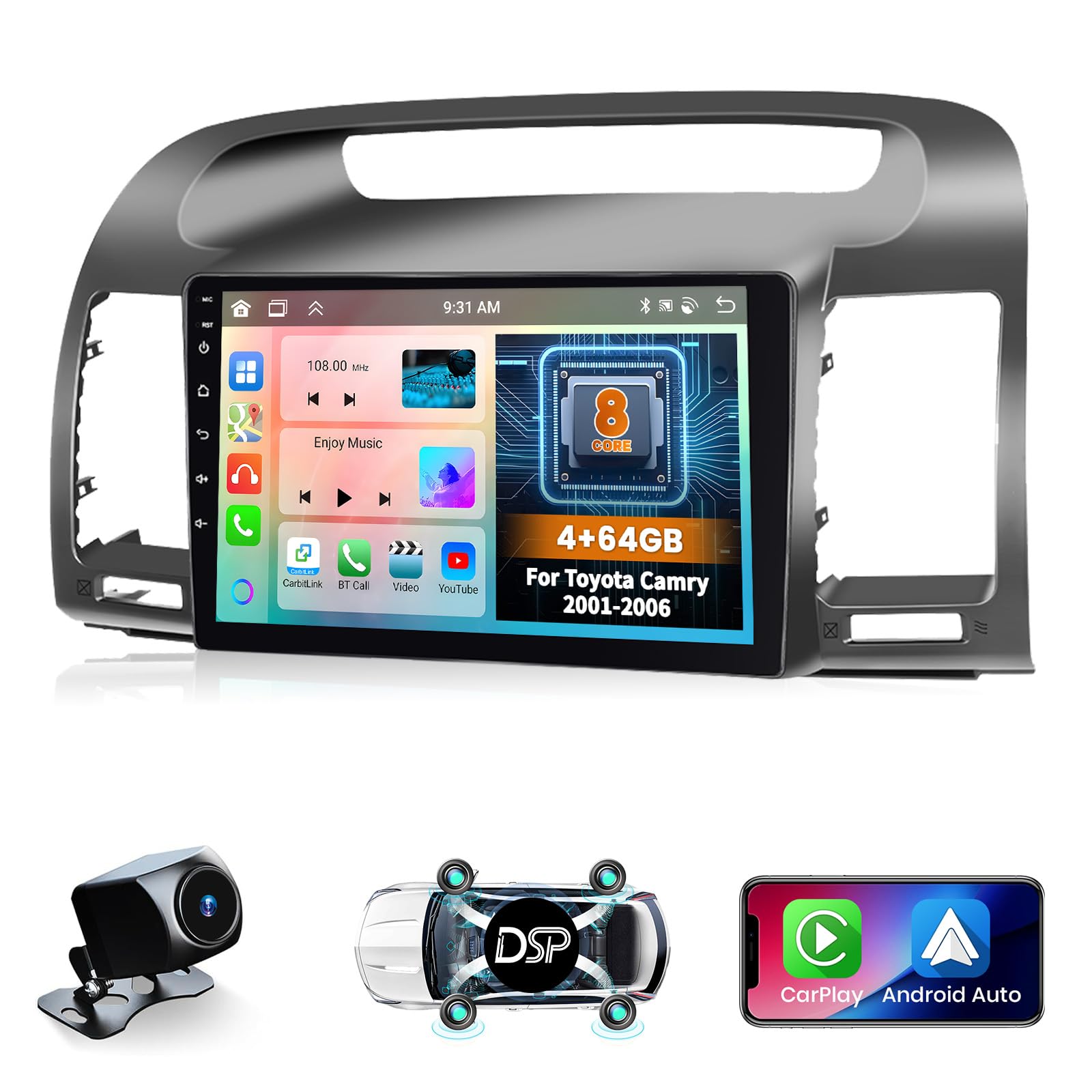 8 Core 4+64GB for Toyota Camry 2000-2006 Android Car Stereo, 9 Inch Touchscreen Carplay Android Auto Car Radio 59UI DSP GPS Navigation WiFi Bluetooth|Electronics