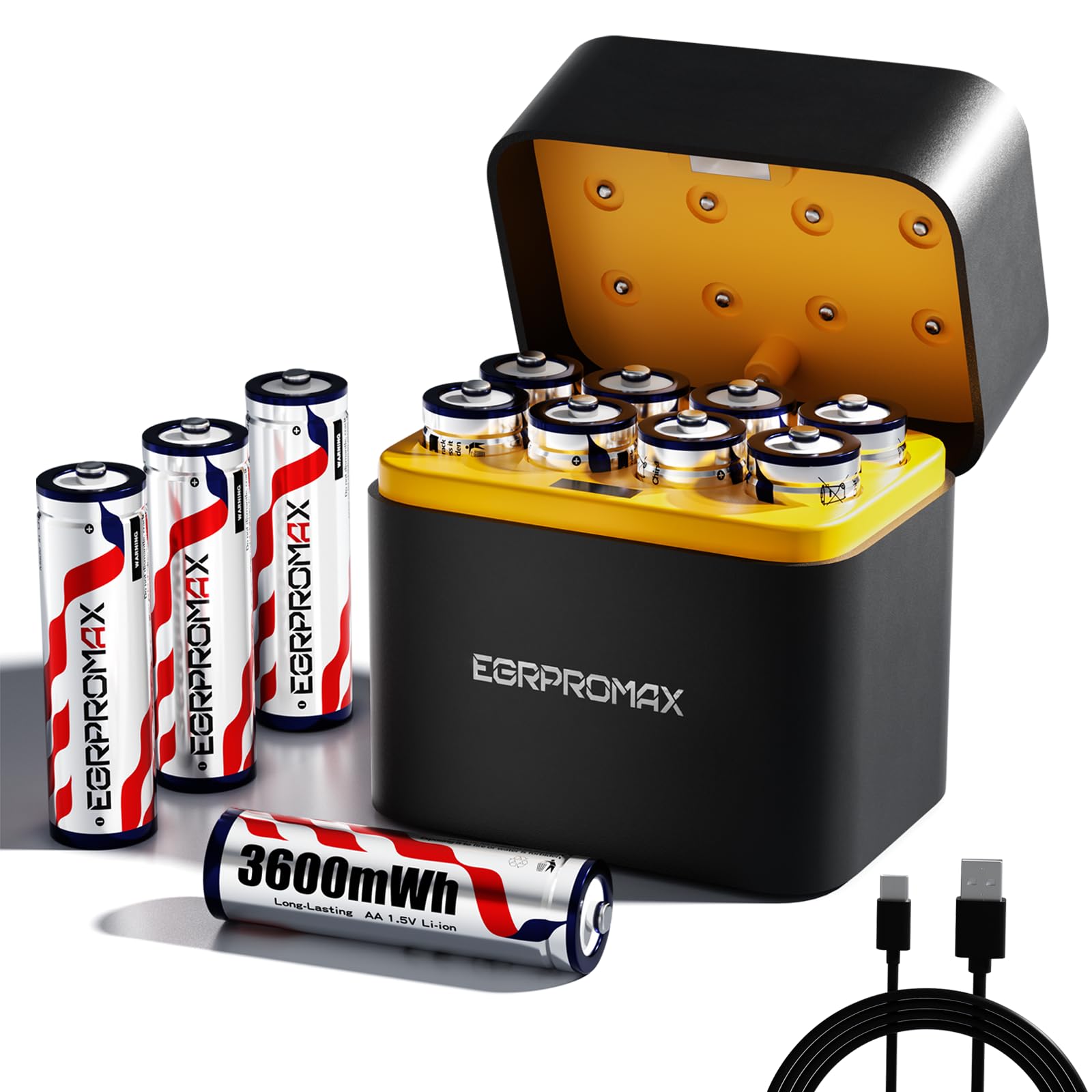 EGRPROMAX Rechargeable AA Batteries Lithium 12 Pack with Charger, 2.5H Fast Charging, 1.5V High Power 3600mWh Double A Batteries, AA Rechargeable|Electronics