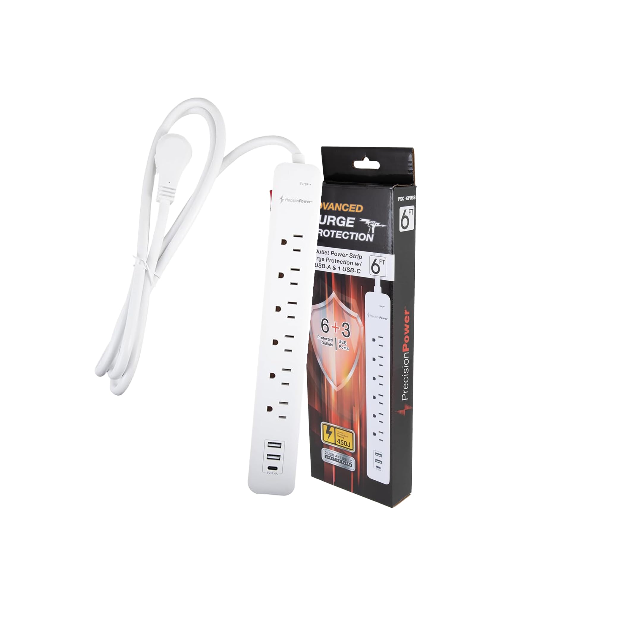 Precision Power Surge Protector Extension – Heavy Duty 6-Feet Cord with 6 Outlets, 3 USB Ports, Multi-Outlet Use w/LED Lights Indicator, Ideal for|Electronics