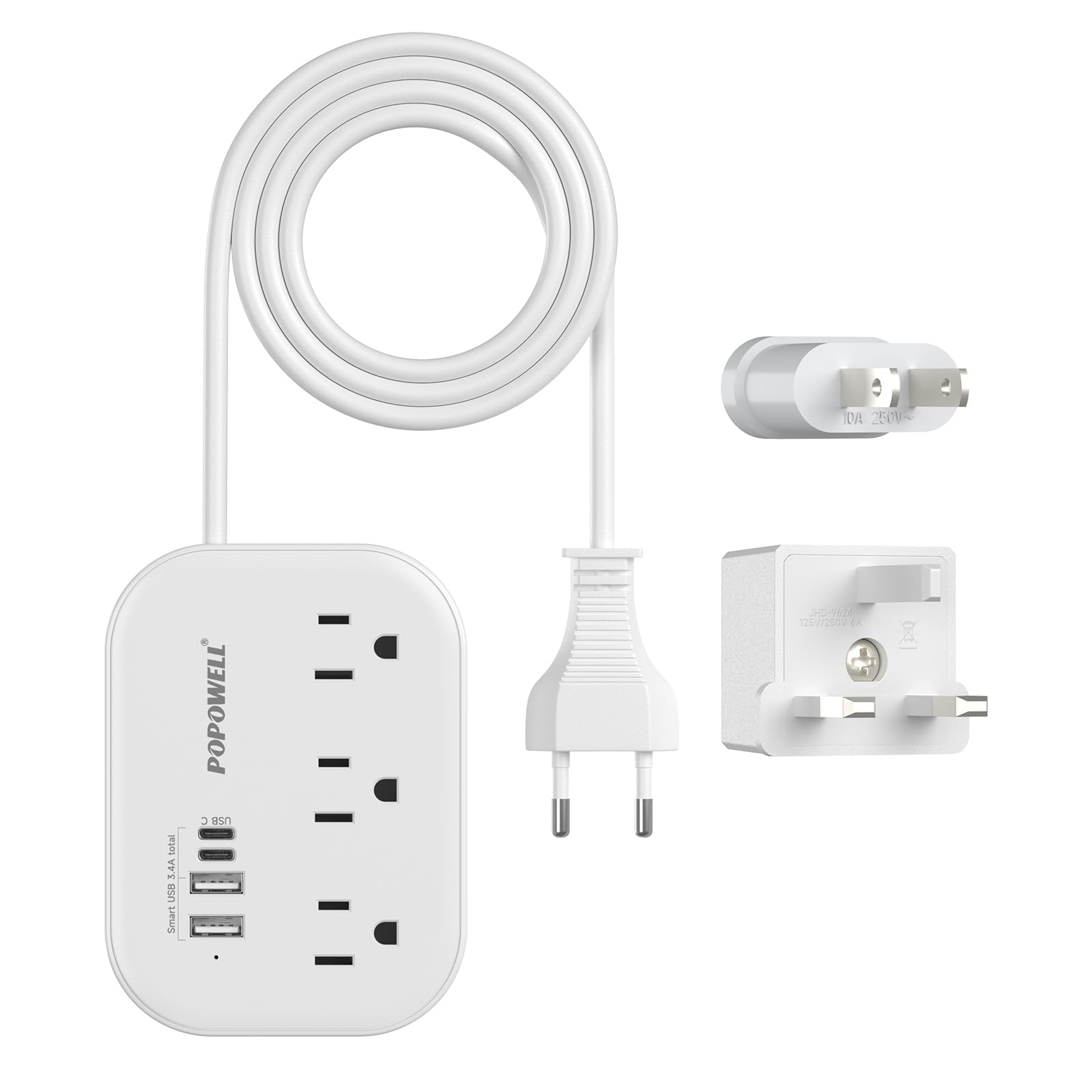 European Plug Adapter,EU/UK/US Travel Power Strip with 3 Outlets & 4 USB Ports(3.4A), International Power Adapter with 3 FT Extension Cord Compact for|Electronics