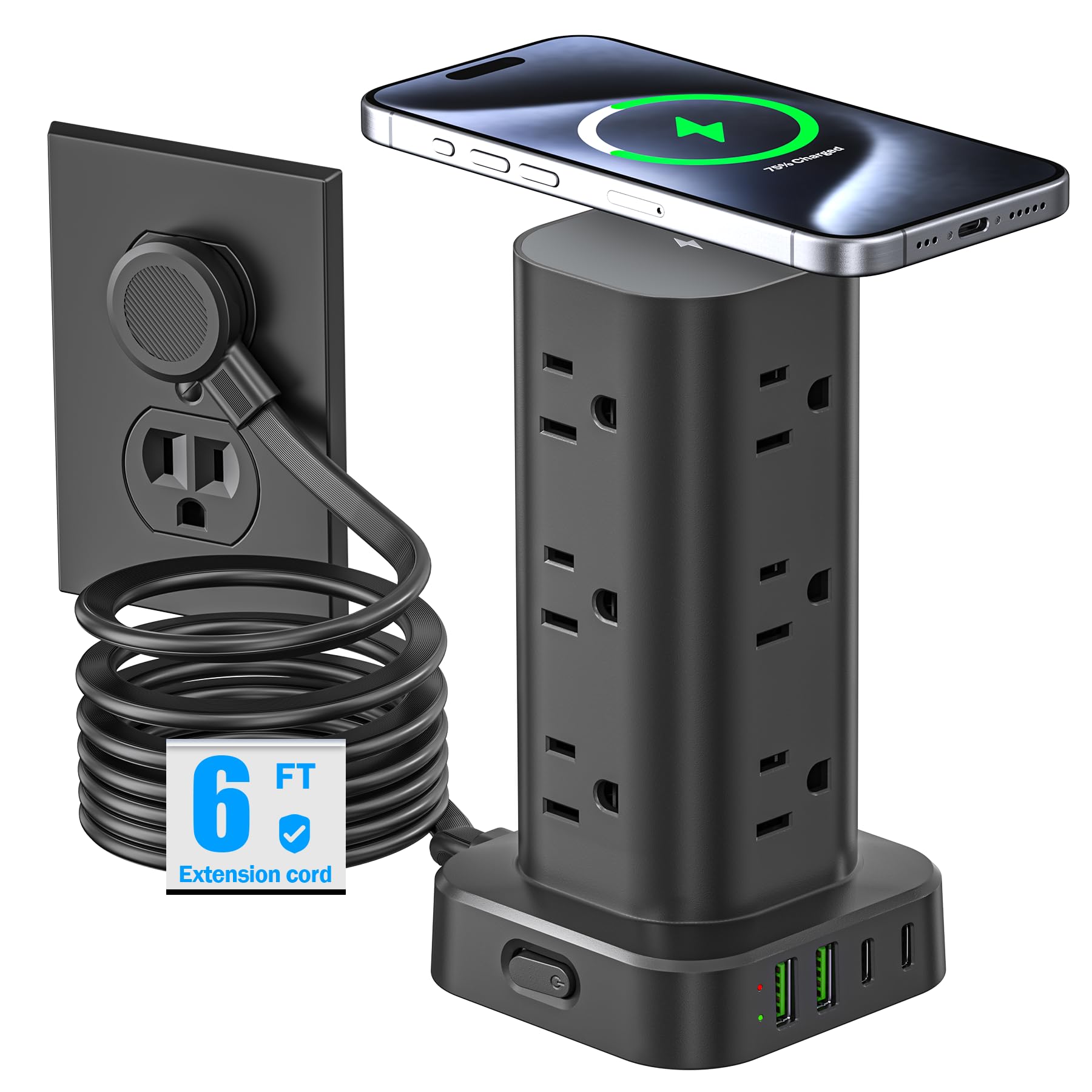Tower Power Strip with 15W Wireless Charger, 6FT Flat Plug Extension Cord with Multiple Outlets, 12 AC Outlets, 4 USB Ports (2 USB C) Charging Station|Electronics