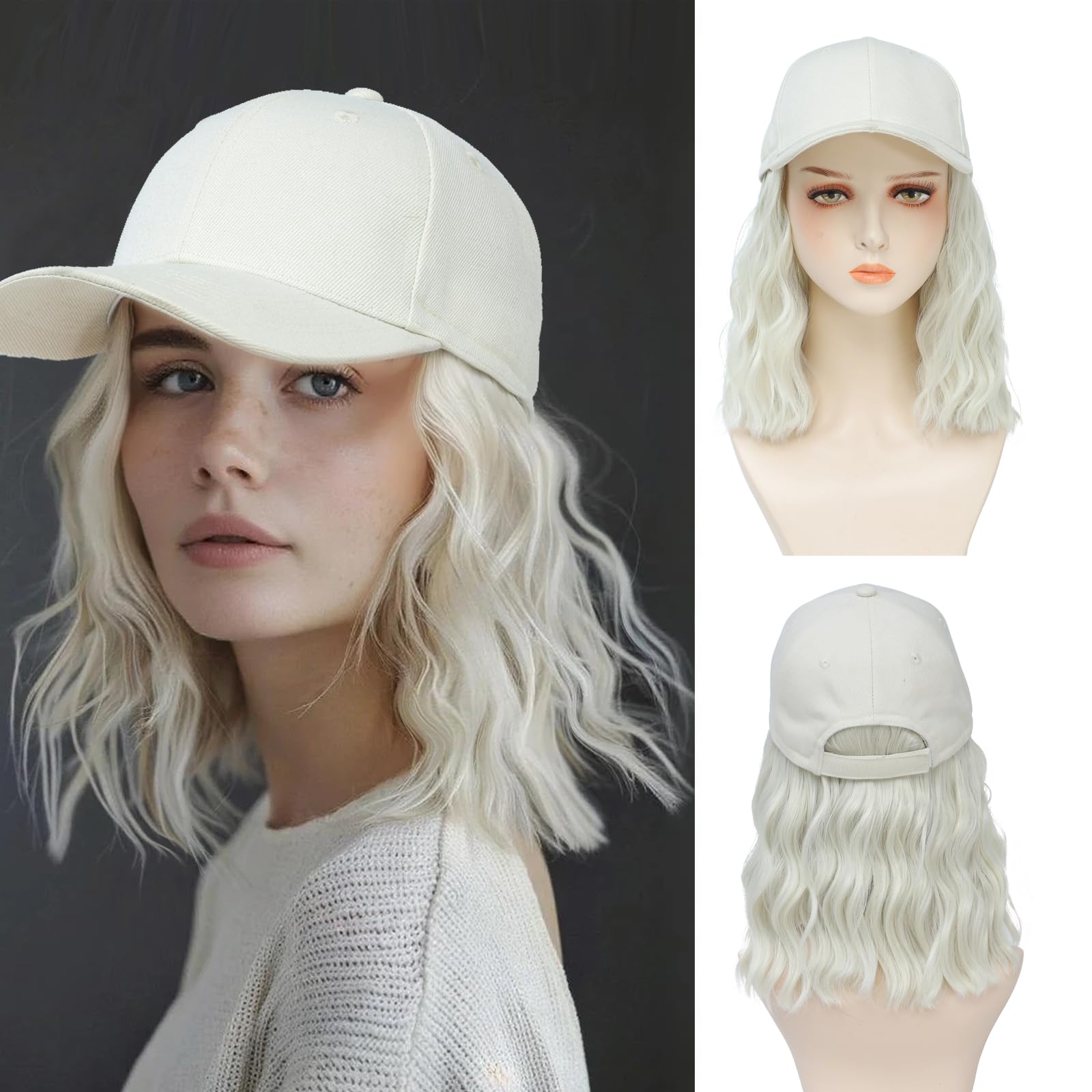 AliRobam Synthetic Wig Hat with Natural Wave Hair Extensions attached for Woman Short Curly Wavy Hairstyle Adjustable Baseball Cap Hat Wig (White,|Health & Beauty