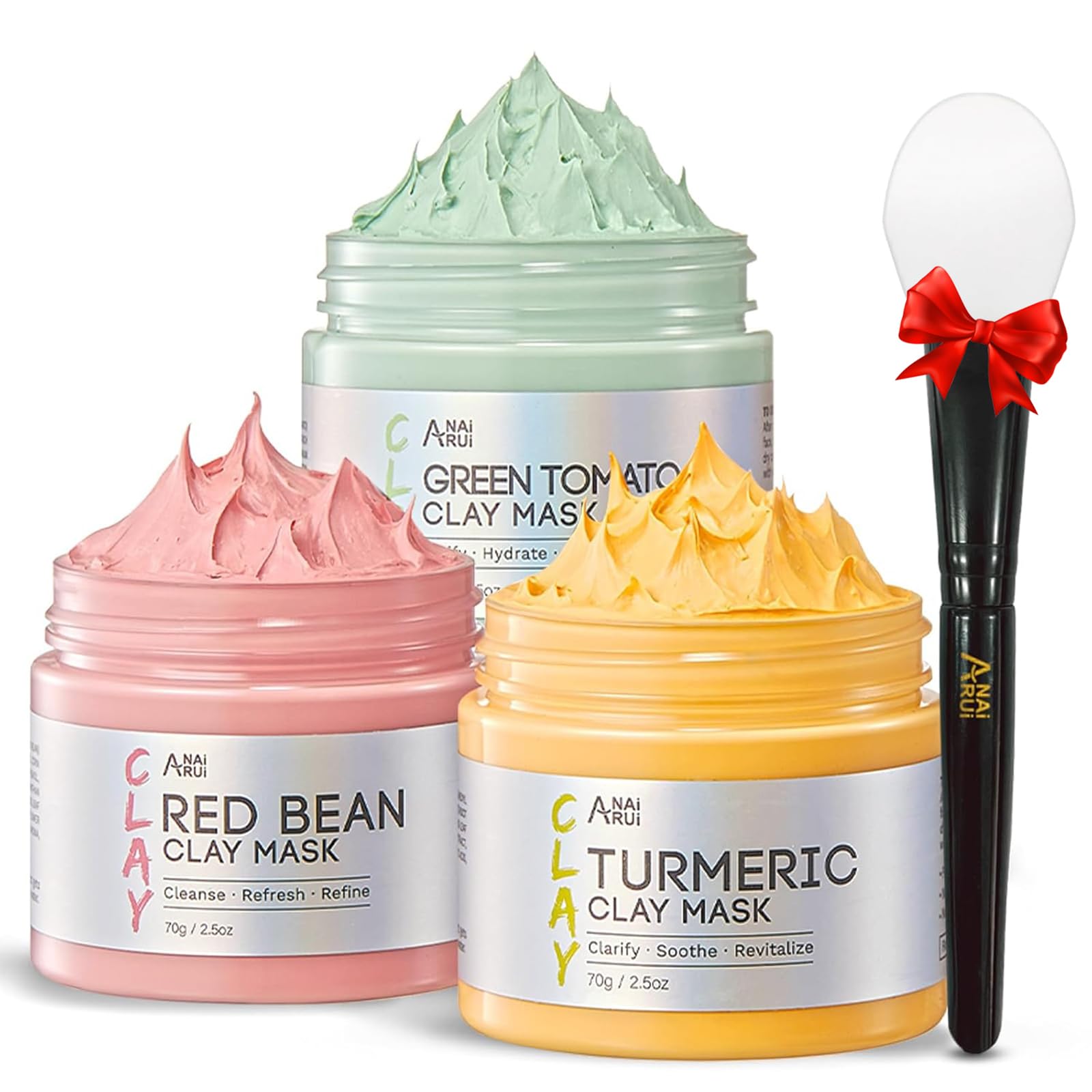 ANAI RUI 3 Pcs Pore Cleansing Face Mask Set Green Tomato Clay Mask - Turmeric Vitamin C Facial Mask Red Bean Refreshing Pore Mask, Relaxing Spa Gift|Health & Beauty