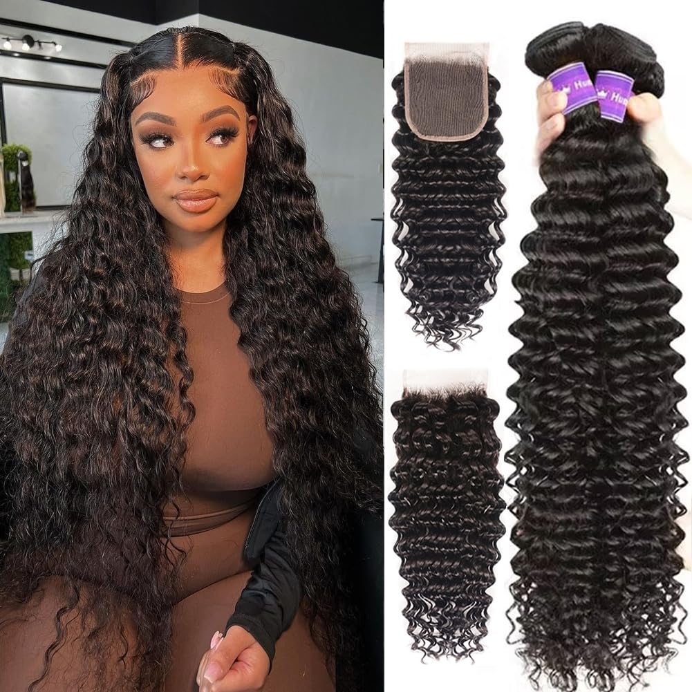 Human Hair Bundles with Closure (22 24 26+20,Free Part) Deep Wave Bundles with Lace Closure Brazilian Human Hair Weave Bundles with Closure Virgin|Health & Beauty