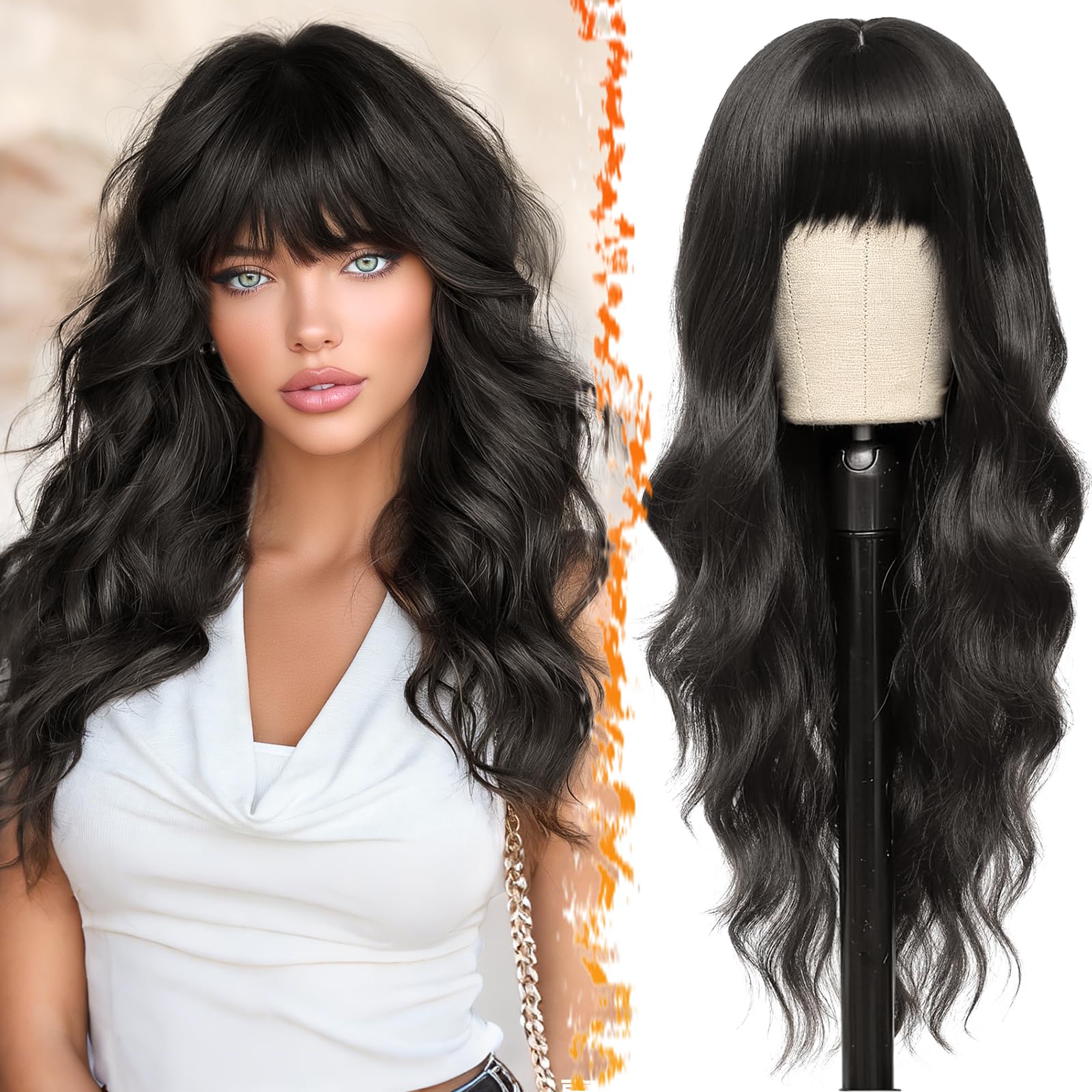 BARSDAR Long Wavy Dark Brown Wig With Bangs - 26 Inch Long Wavy Dark Brown Wig with Bangs for Women - Thick Soft Synthetic Hair Replacement Wigs|Health & Beauty