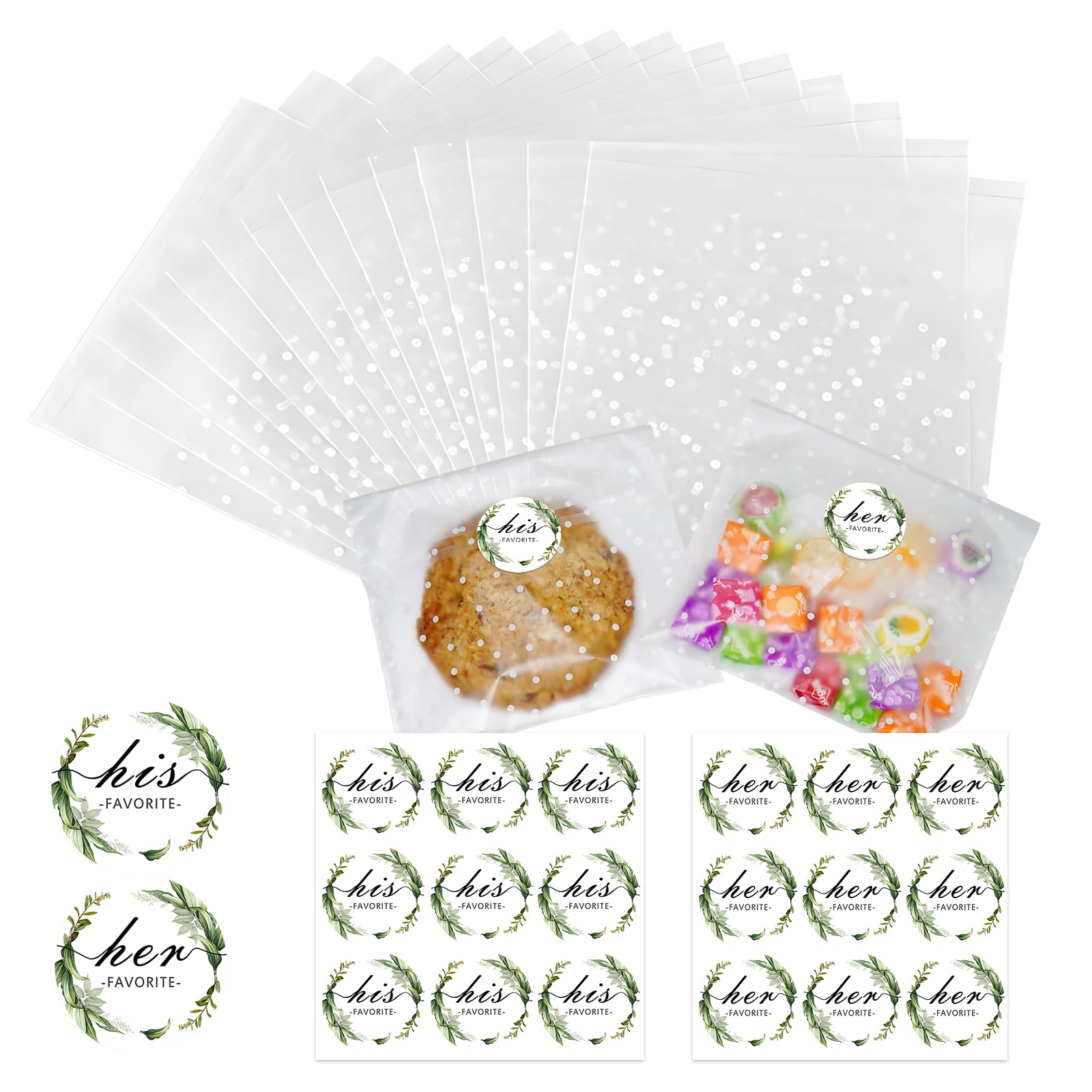 100 PCS White Dot Wedding cellophane Cookie Bags|Self Sealing Treat Bags 100 his favorite her favorite stickers Labels for Wedding Favors,Packing,|Health & Beauty