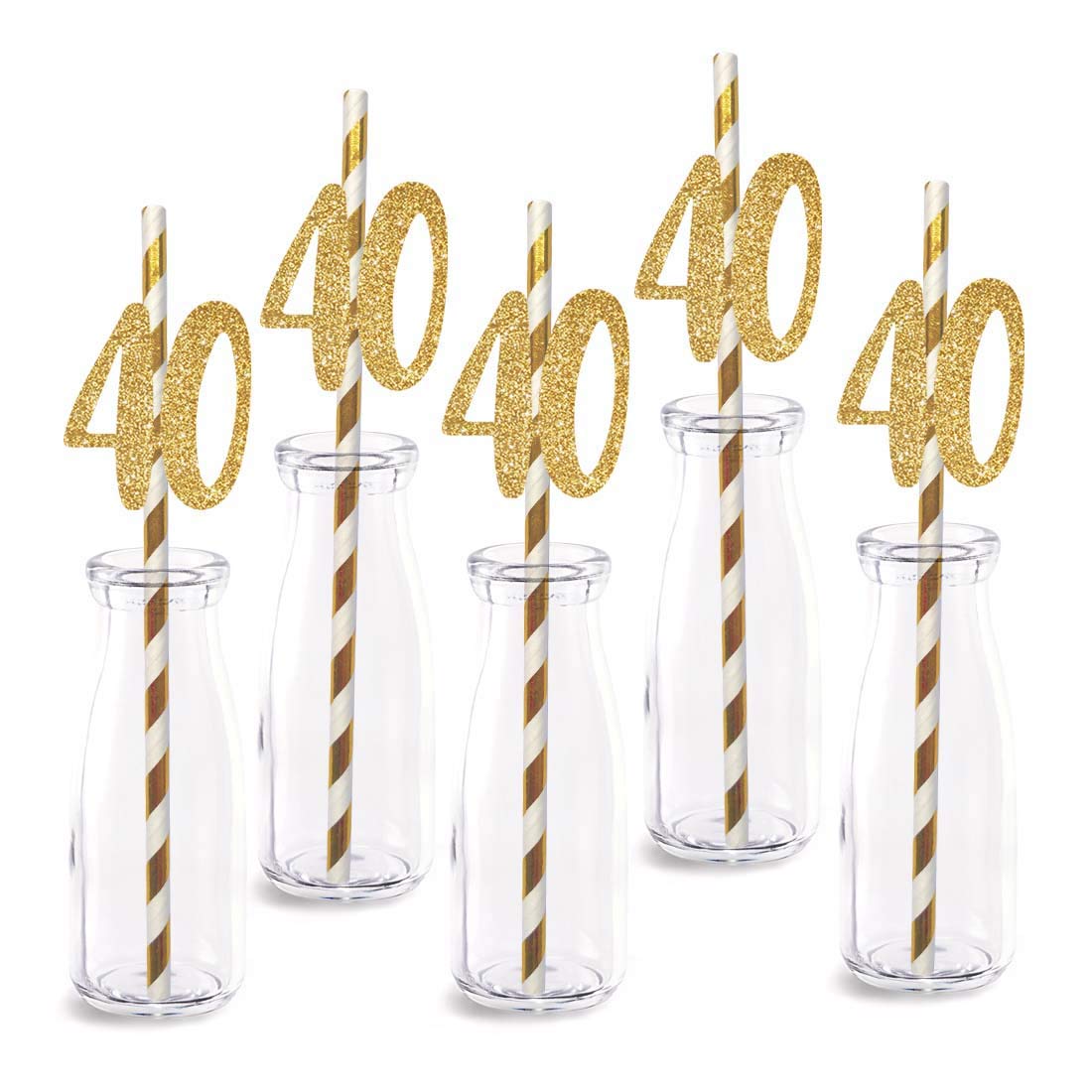 40th Birthday Paper Straw Decor, 24-Pack Real Gold Glitter Cut-Out Numbers Happy 40 Years Party Decorative Straws|Health & Beauty