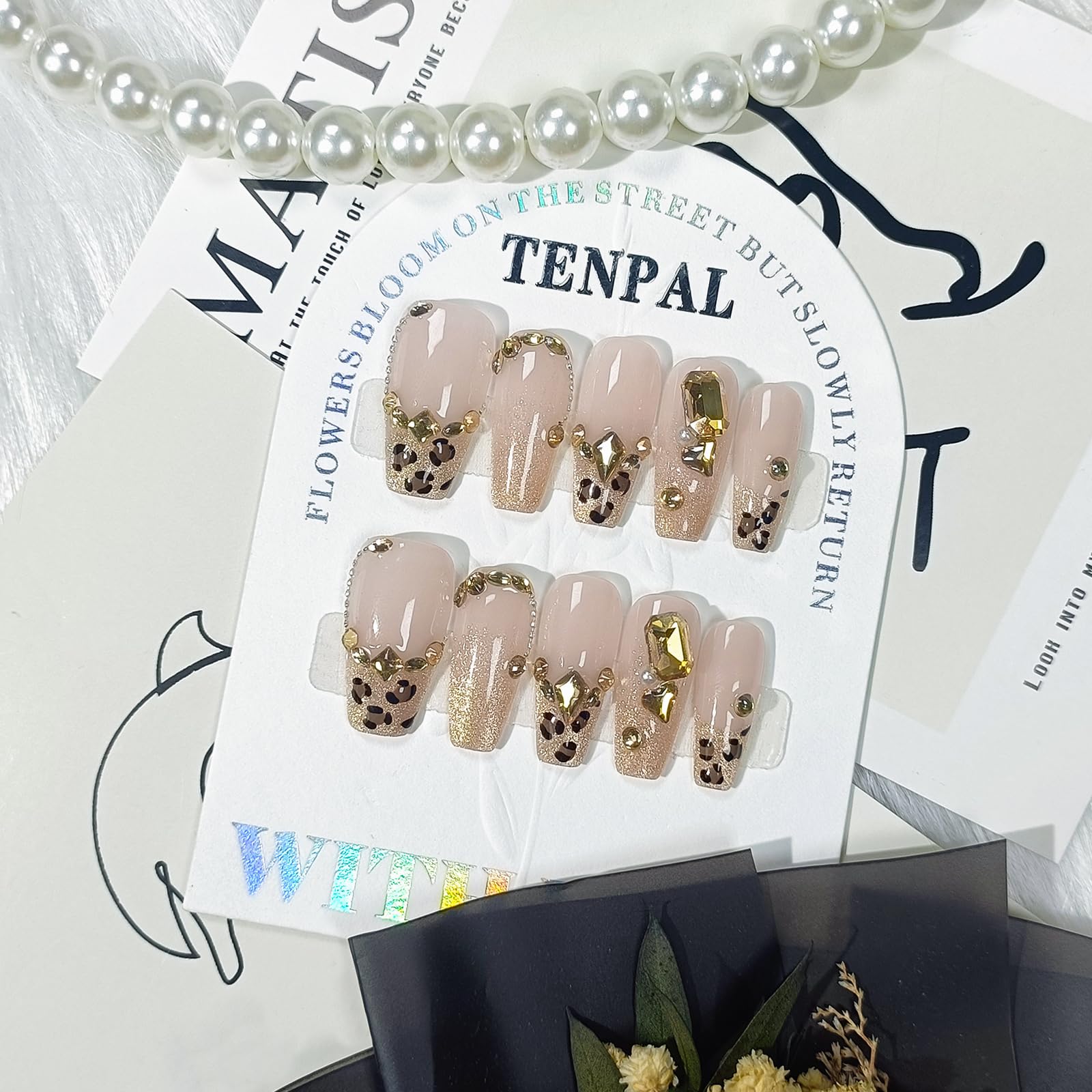 TENPAL Handmade Leopard Cat Eye French Glitter Design Fake Nails,Resuable 10Pcs Press on Nails Medium Kit,Luxury Coffin Shaped Glam Glue on Nails for|Health & Beauty