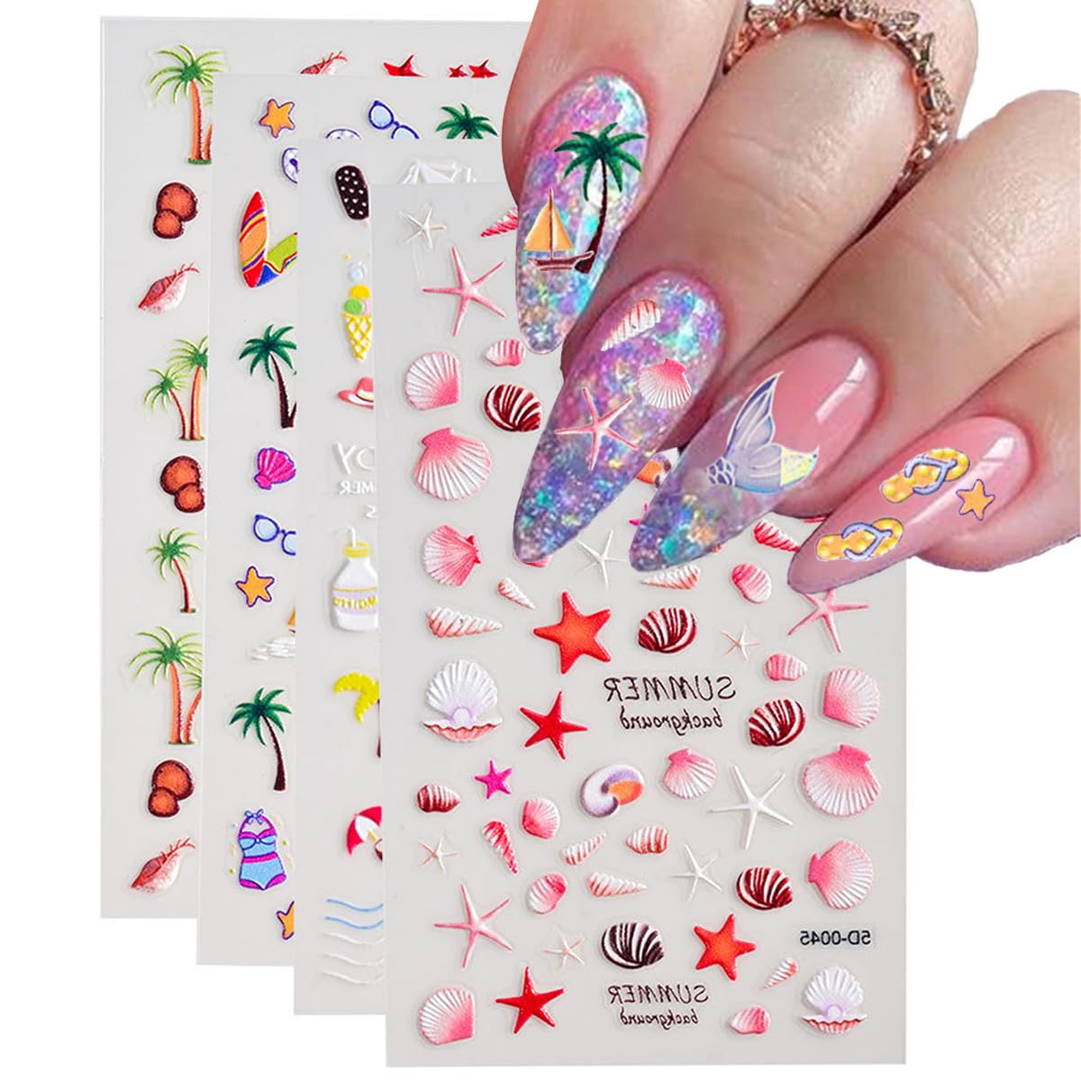 Summer 5D Embossed Ocean Nail Art Stickers Beach Nail Decals Self-Adhesive Nail Stickers Starfish Sea Shell Tree Designs Nail Art Supplies for Women|Health & Beauty