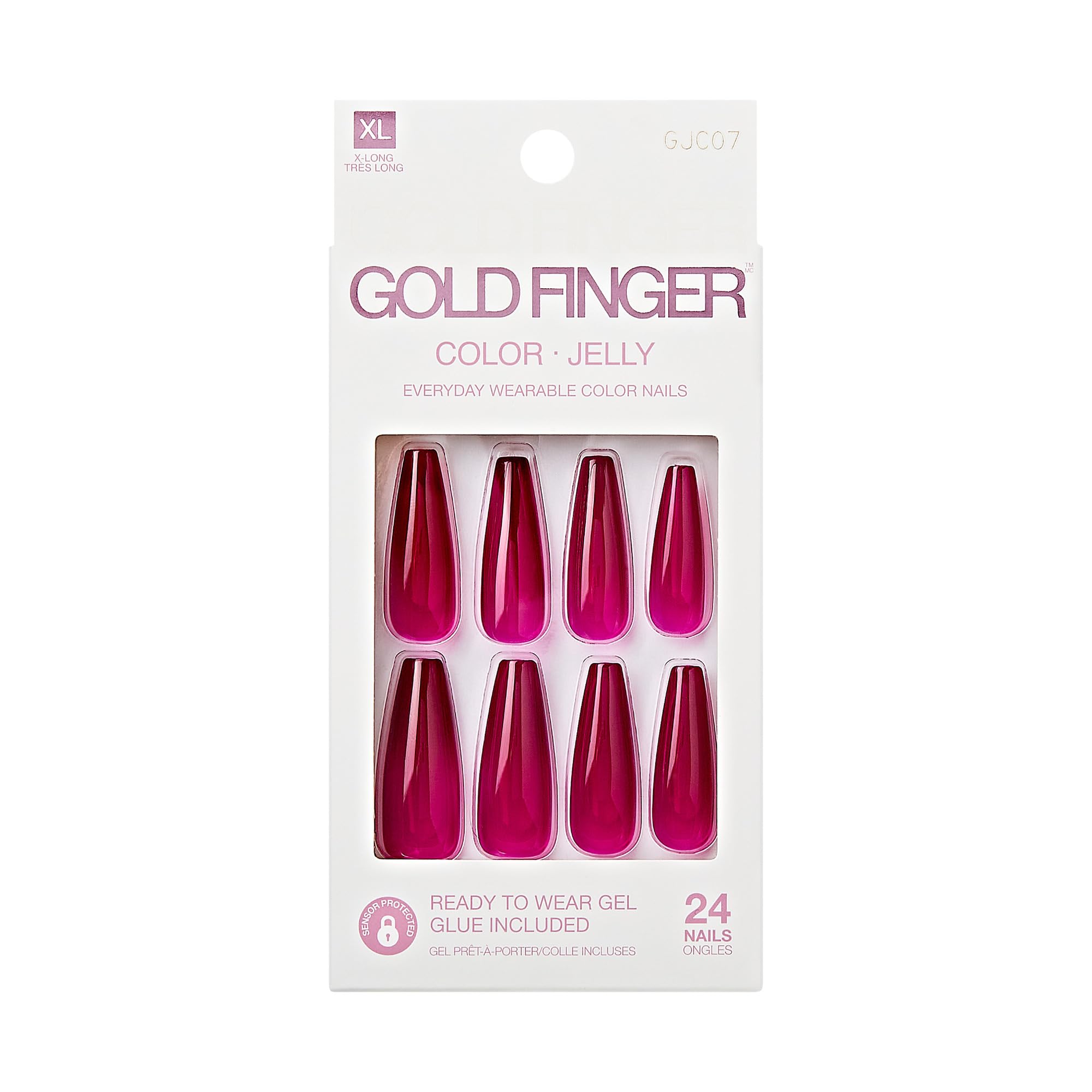 GoldFinger False Nails Kit, Jelly Color Ready to Wear Berry Fake Nails, Manicure Stick and Glue Included, X-Long Length, Coffin Shape, Long-Lasting|Health & Beauty