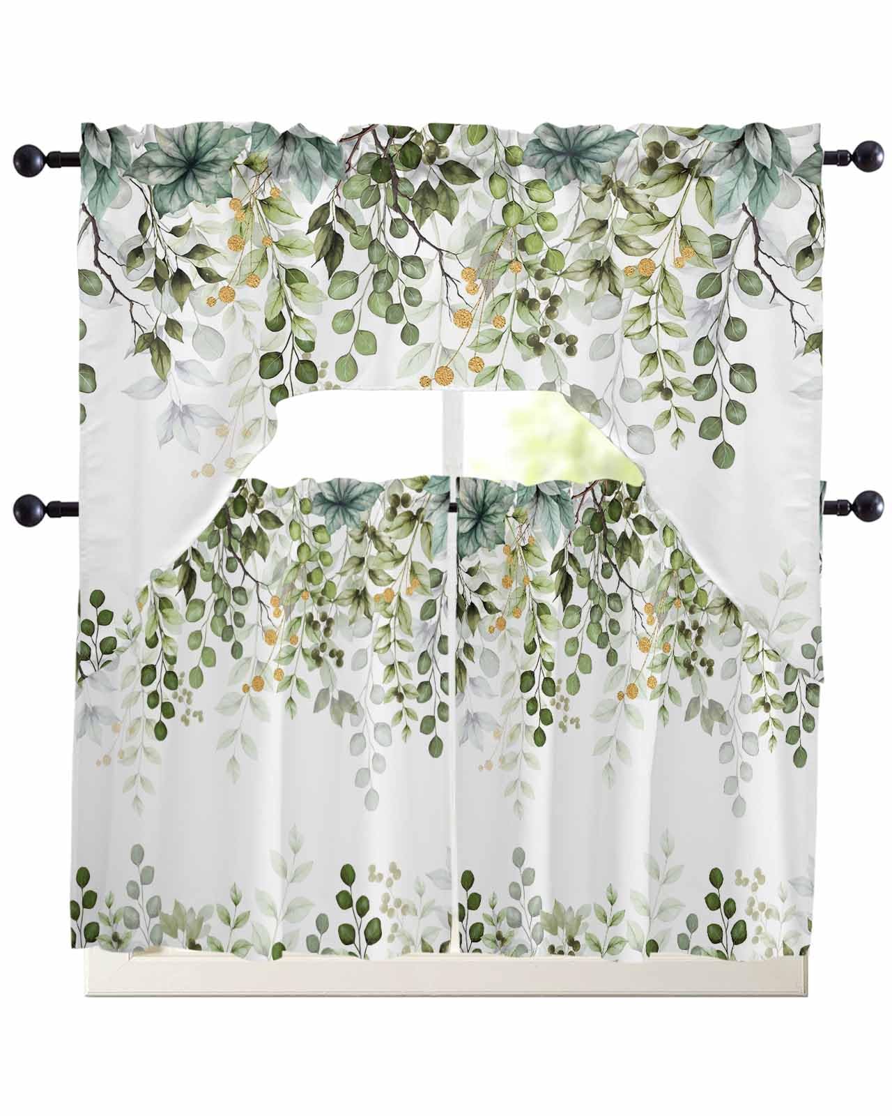 Sage Green Eucalyptus Leaves Swag Curtains Valance and Tier Set, Herb Botanical Rod Pocket Curtain Drapes for Bedroom Bathroom Over Sink Kitchen|Home & Garden